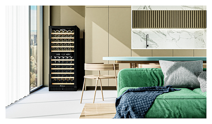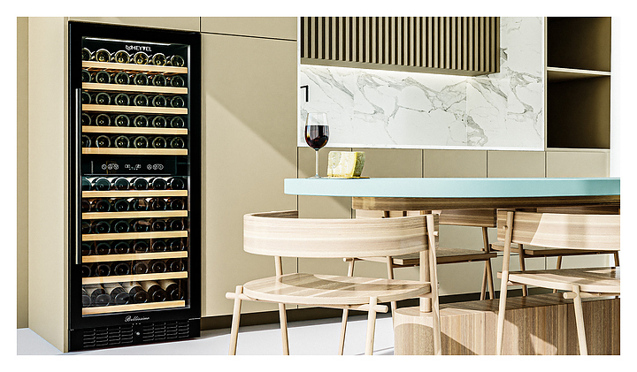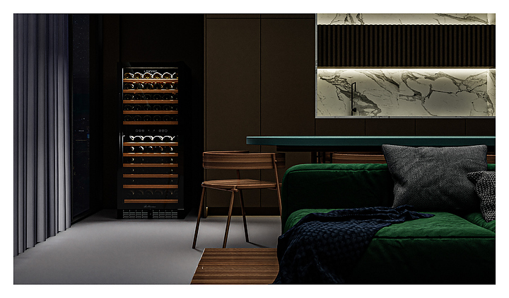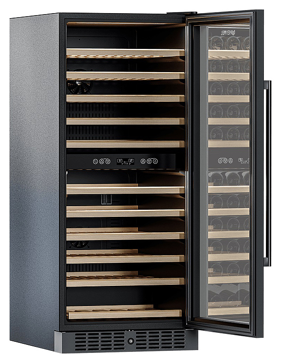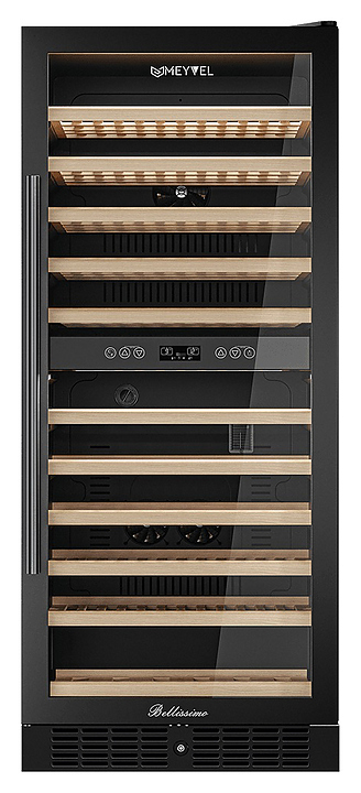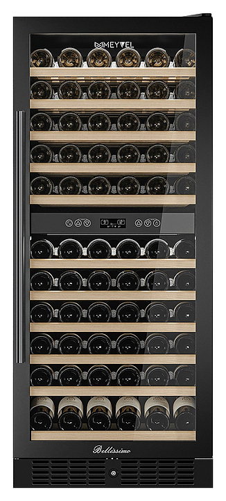 Винный шкаф MEYVEL MV116-KBT2 предназначен для демонстрации, хранения и создания оптимальных условий для сохранения всех вкусовых свойств вина в бутылках на предприятиях общественного питания, торговли, в барах, ресторанах, специализированных магазинах, частных домах или квартирах. Модель оснащена сенсорной панелью управления, 2 электронными термостатами и внутренней светодиодной подсветкой. Корпус и дверная ручка выполнены из окрашенной в черный цвет стали, дверь - из тройного стекла с УФ защитой с черной рамкой, полки - из массива бука.