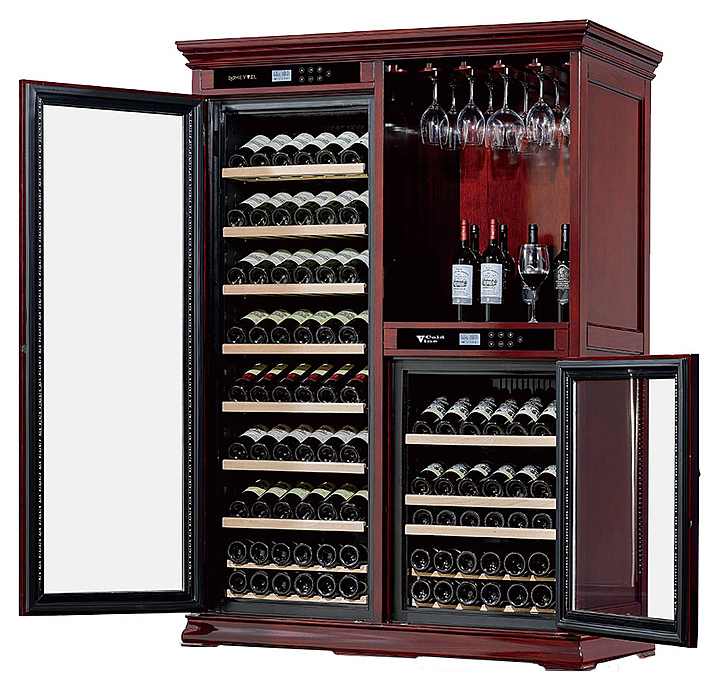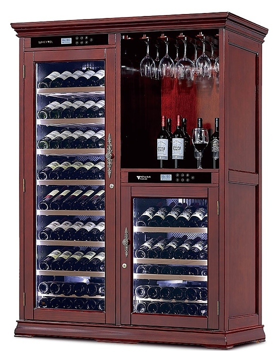 Винный шкаф MEYVEL MV154-WM2-BAR-C предназначен для демонстрации, хранения и создания оптимальных условий для сохранения всех вкусовых свойств вина в бутылках на предприятиях общественного питания, торговли, в барах, ресторанах, специализированных магазинах, частных домах или квартирах. Модель оснащена сенсорной панелью управления, электронным термостатом и светодиодной подсветкой. Корпус выполнен из обшитой деревом стали, дверь - из деревянной рамы и тройного стекла с защитой от ультрафиолетовых лучей, полки - из массива бука.