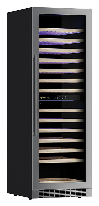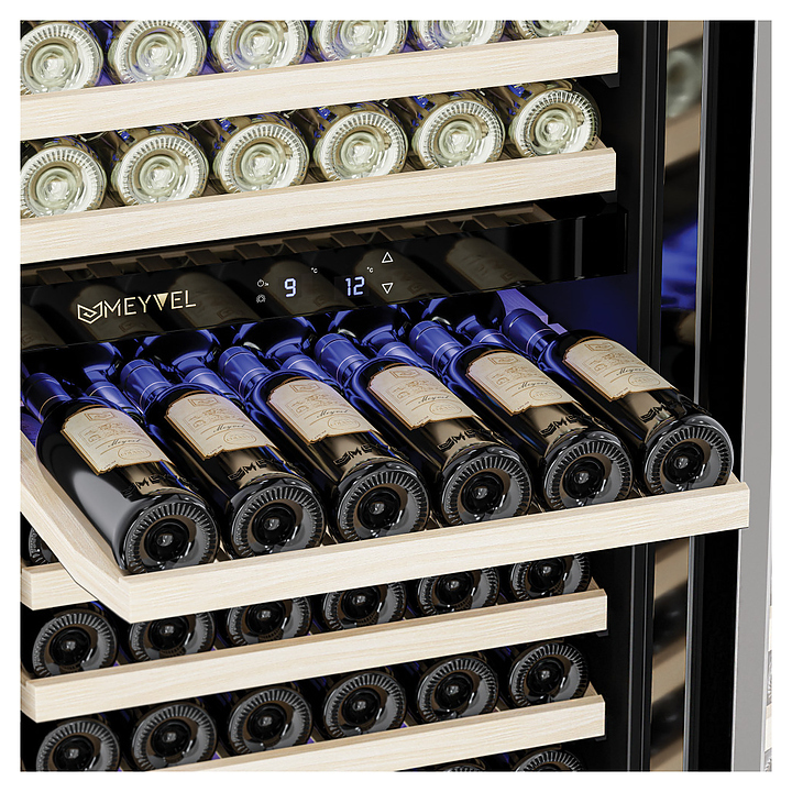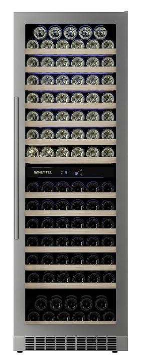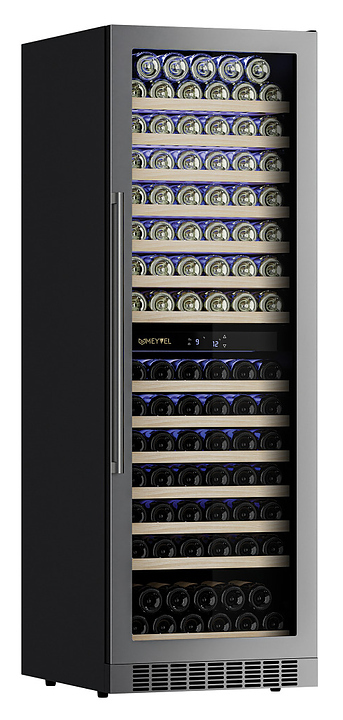 Винный шкаф MEYVEL MV163-KST2 предназначен для демонстрации, хранения и создания оптимальных условий для сохранения всех вкусовых свойств вина в бутылках на предприятиях общественного питания, торговли, в барах, ресторанах, специализированных магазинах, частных домах или квартирах. Модель оснащена сенсорной панелью управления, электронным термостатом и синей внутренней светодиодной подсветкой. Корпус и ручка выполнены из стали, дверь - из стальной рамы и двойного стекла с защитой от ультрафиолетовых лучей, полки - из массива бука.