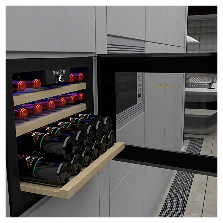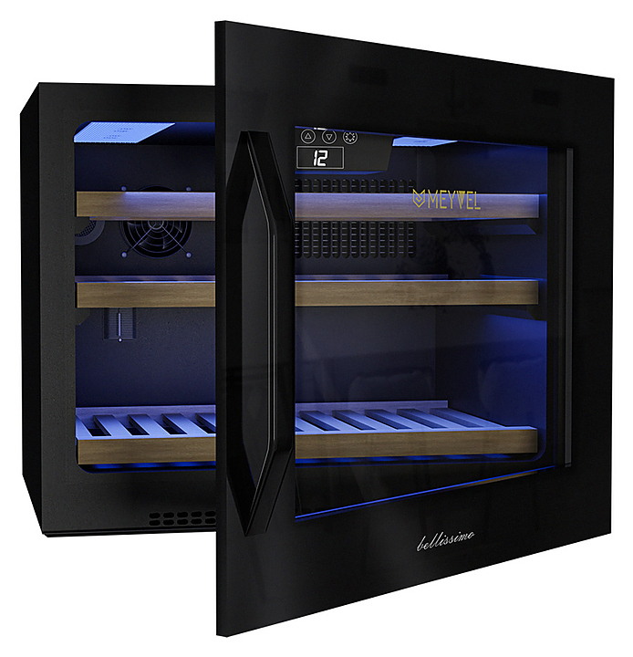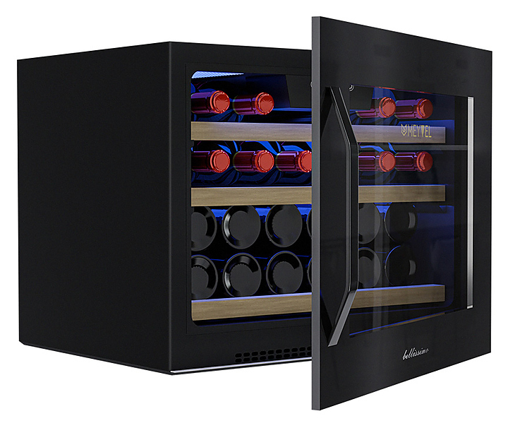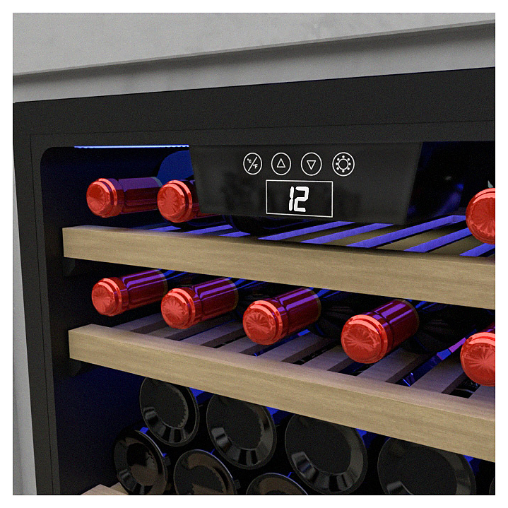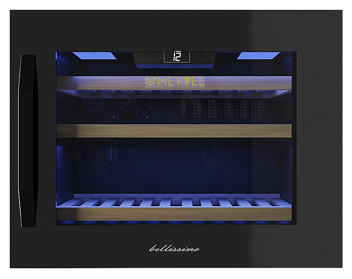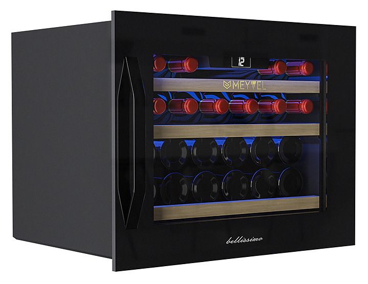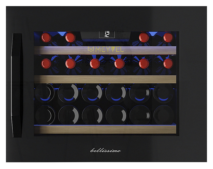 Винный шкаф MEYVEL MV22-KBB1 предназначен для демонстрации, хранения и создания оптимальных условий для сохранения всех вкусовых свойств вина в бутылках на предприятиях общественного питания, торговли, в барах, ресторанах, специализированных магазинах, частных домах или квартирах. Модель оснащена сенсорной панелью управления, электронным термостатом и внутренней светодиодной подсветкой. Корпус и дверная ручка выполнены из окрашенной в черный цвет стали, дверь - из двойного стекла с УФ защитой с черной рамкой, полки - из массива бука.