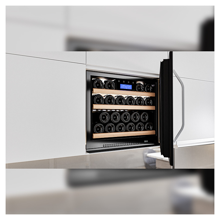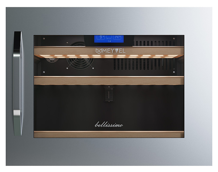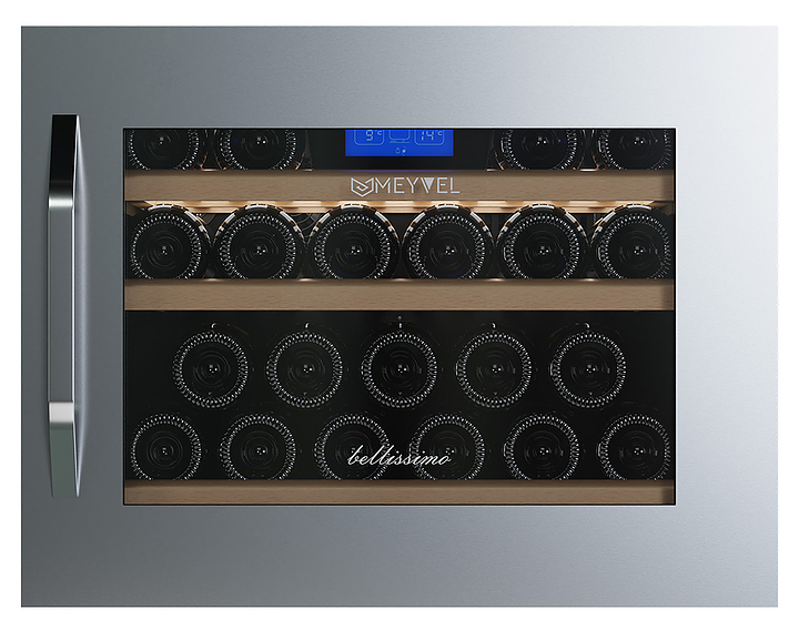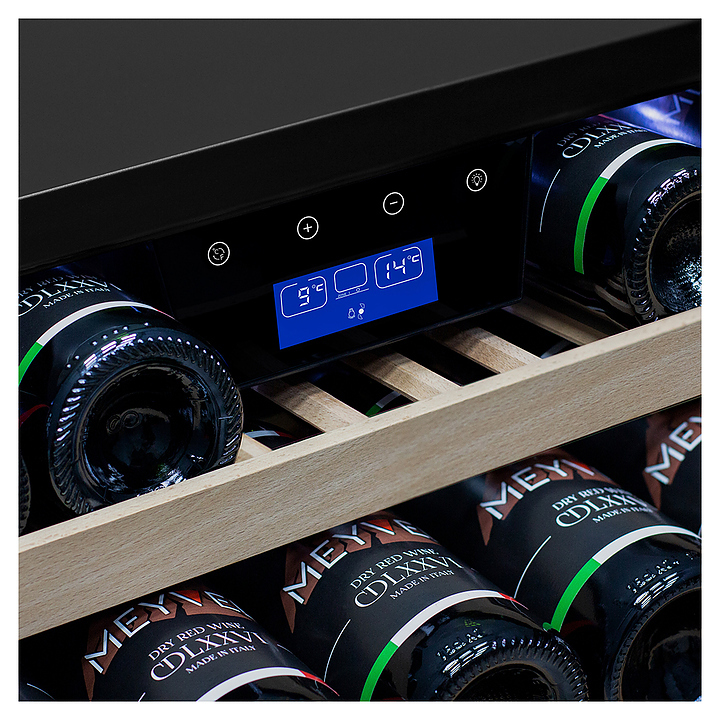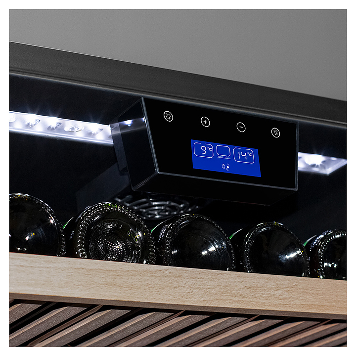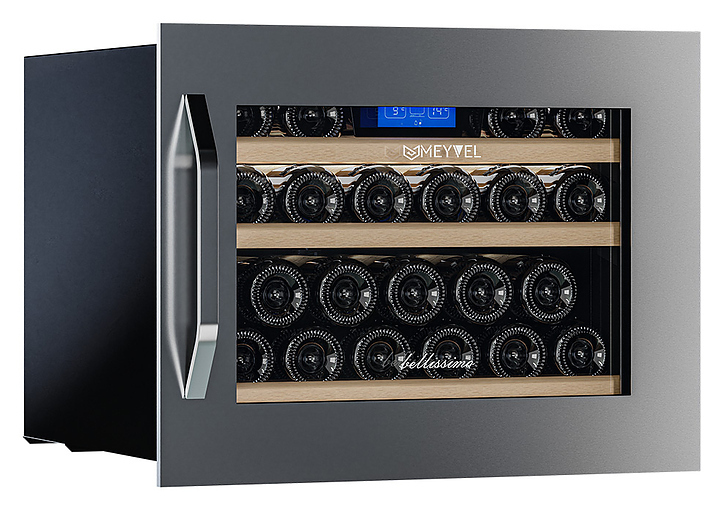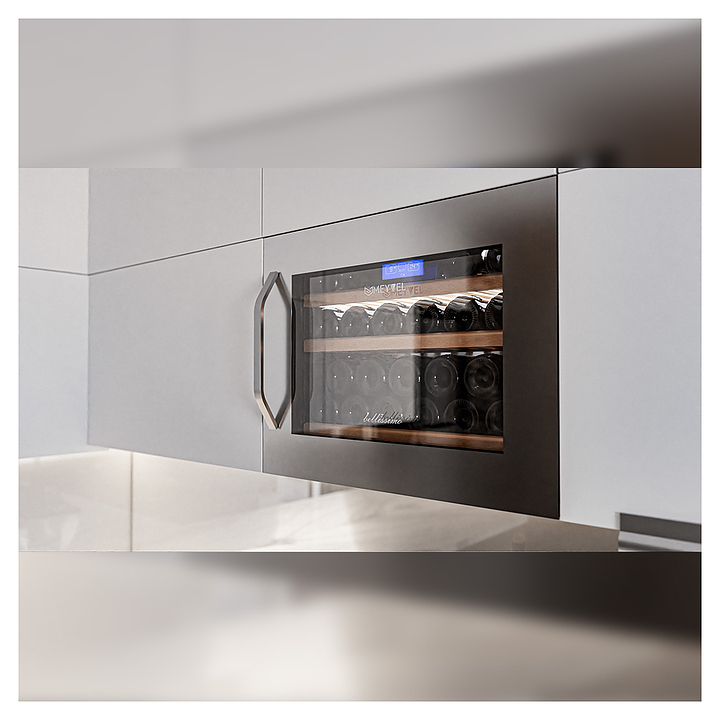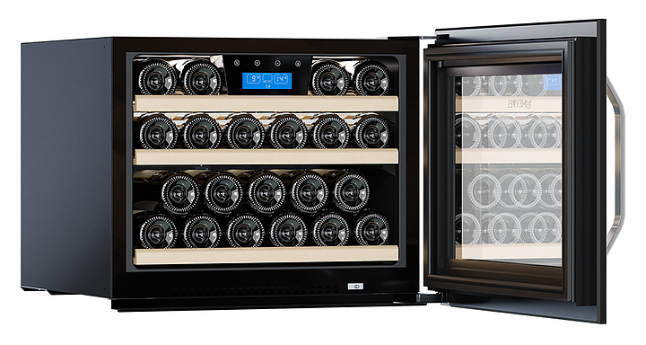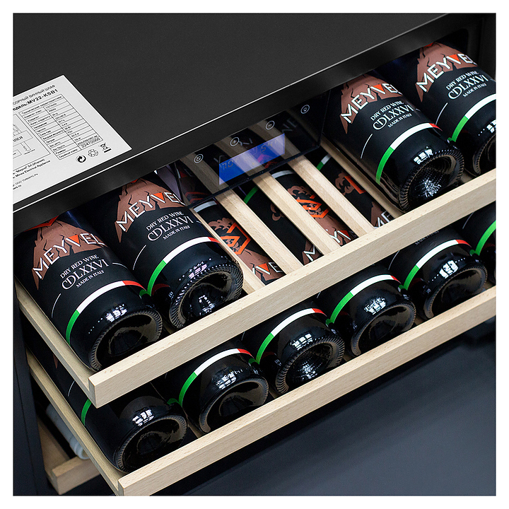 Винный шкаф MEYVEL MV22-KSB1предназначен для демонстрации, хранения и создания оптимальных условий для сохранения всех вкусовых свойств вина в бутылках на предприятиях общественного питания, торговли, в барах, ресторанах, специализированных магазинах, частных домах или квартирах. Модель оснащена сенсорной панелью управления, электронным термостатом и светодиодной подсветкой. Корпус выполнен из окрашенной в черный цвет стали, дверь - из бесшовной стальной рамы и двойного стекла с защитой от ультрафиолетовых лучей, полки - из массива бука.