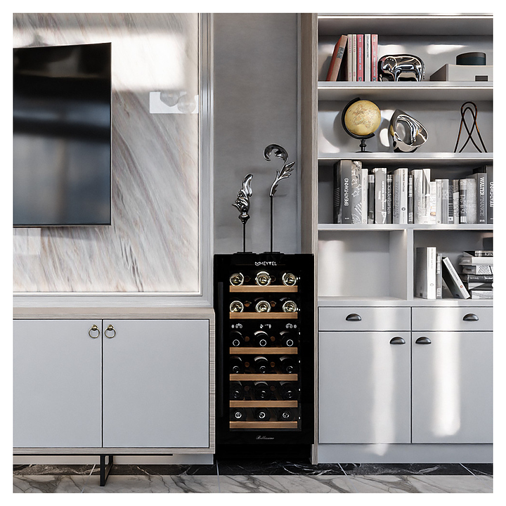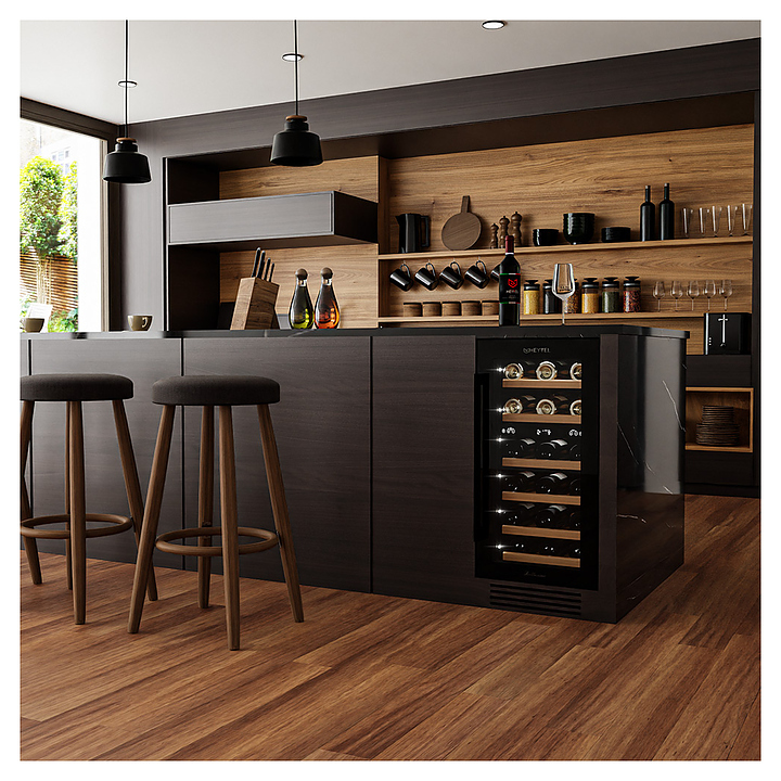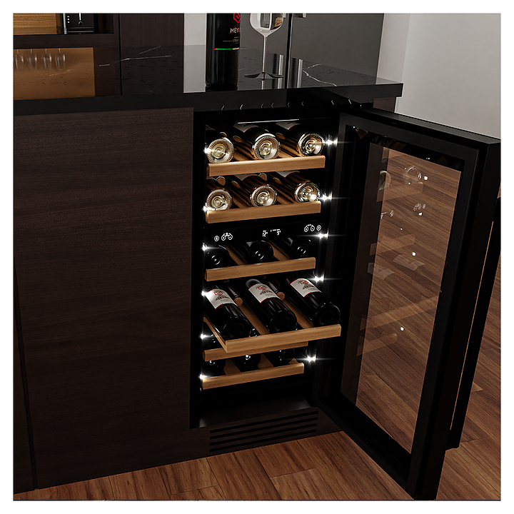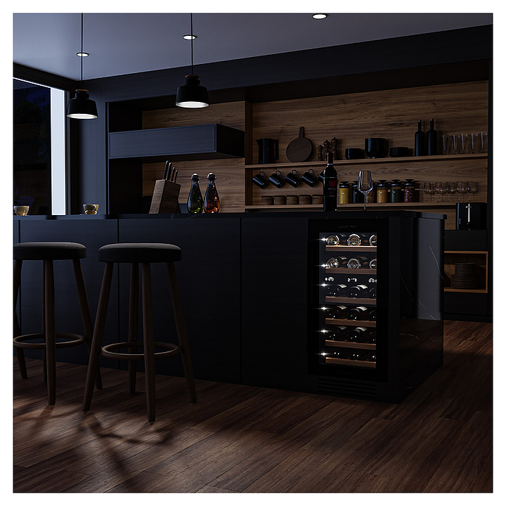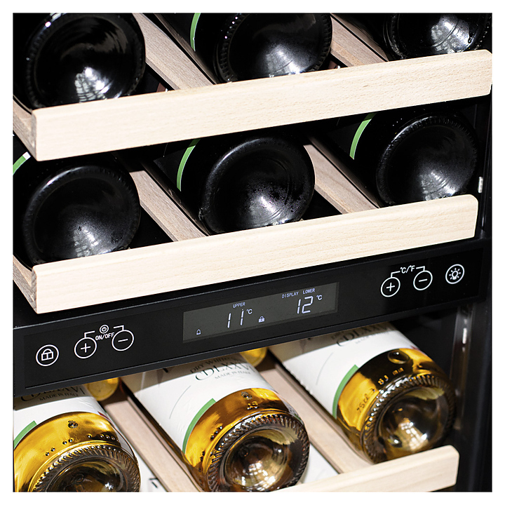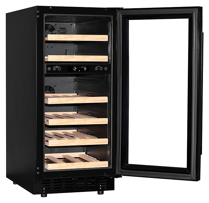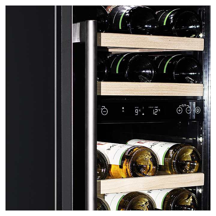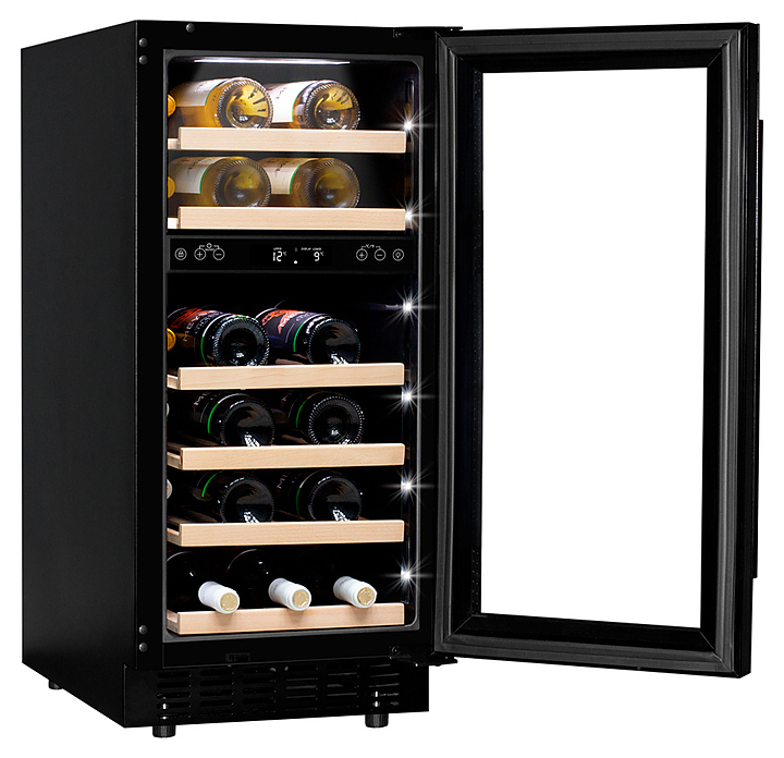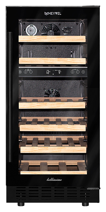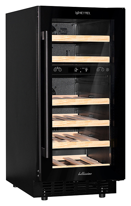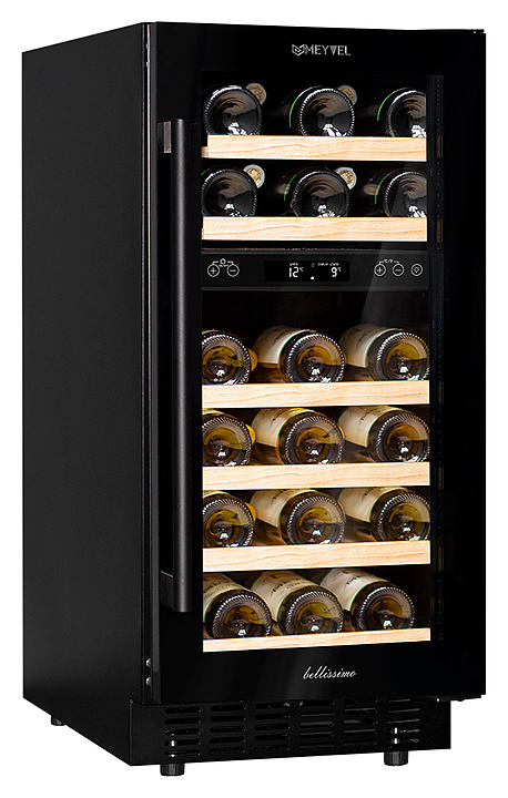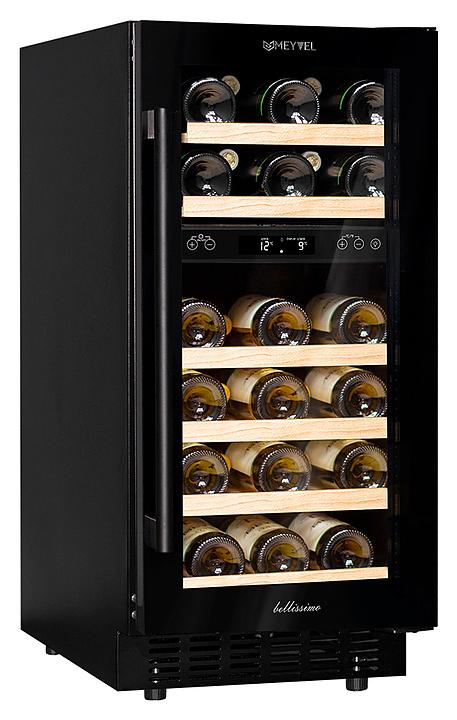 Винный шкаф MEYVEL MV28-KBT2 предназначен для демонстрации, хранения и создания оптимальных условий для сохранения всех вкусовых свойств вина в бутылках на предприятиях общественного питания, торговли, в барах, ресторанах, специализированных магазинах, частных домах или квартирах. Модель оснащена сенсорной панелью управления, 2 электронными термостатами и внутренней белой светодиодной подсветкой. Корпус и дверная ручка выполнены из окрашенной в черный цвет стали, дверь - из тройного стекла с УФ защитой с черной рамкой, полки - из массива бука.