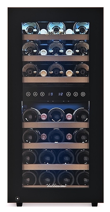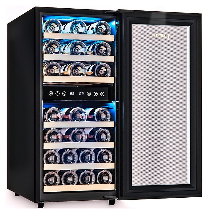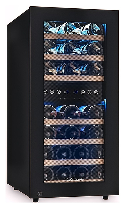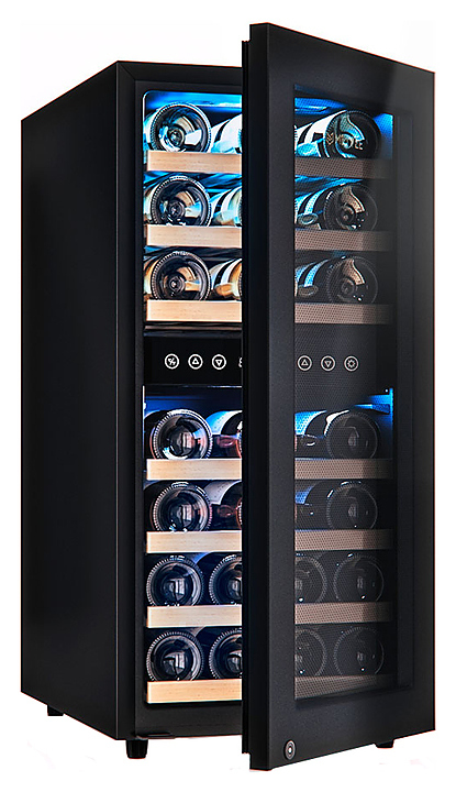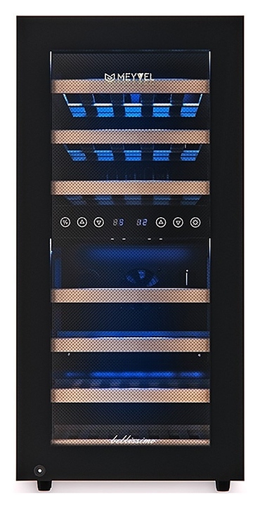Винный шкаф MEYVEL MV33-KBF2 предназначен для демонстрации, хранения и создания оптимальных условий для сохранения всех вкусовых свойств вина в бутылках на предприятиях общественного питания, торговли, в барах, ресторанах, специализированных магазинах, частных домах или квартирах. Модель оснащена сенсорной панелью управления, электронным термостатом и светодиодной подсветкой синего цвета в каждой зоне. Корпус выполнен из окрашенной в черный цвет стали, дверь - из пластиковой рамы и тонированного стекла с защитой от ультрафиолетовых лучей, полки - из массива бука.