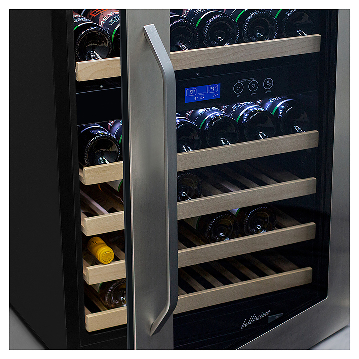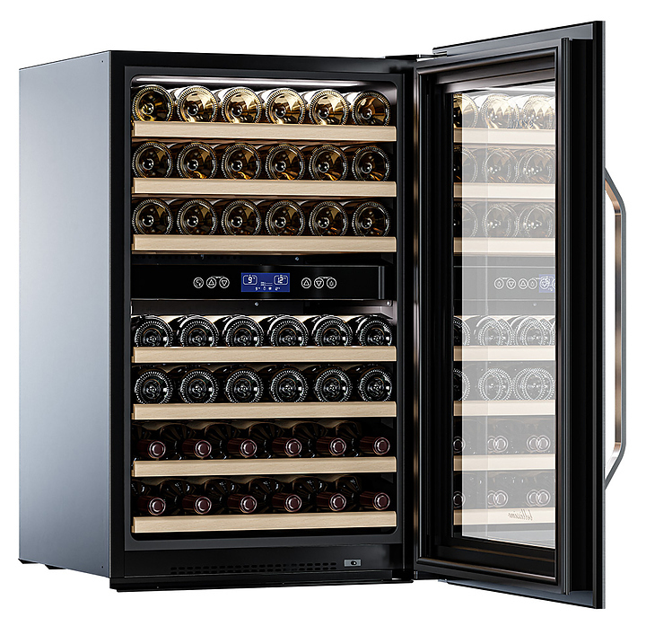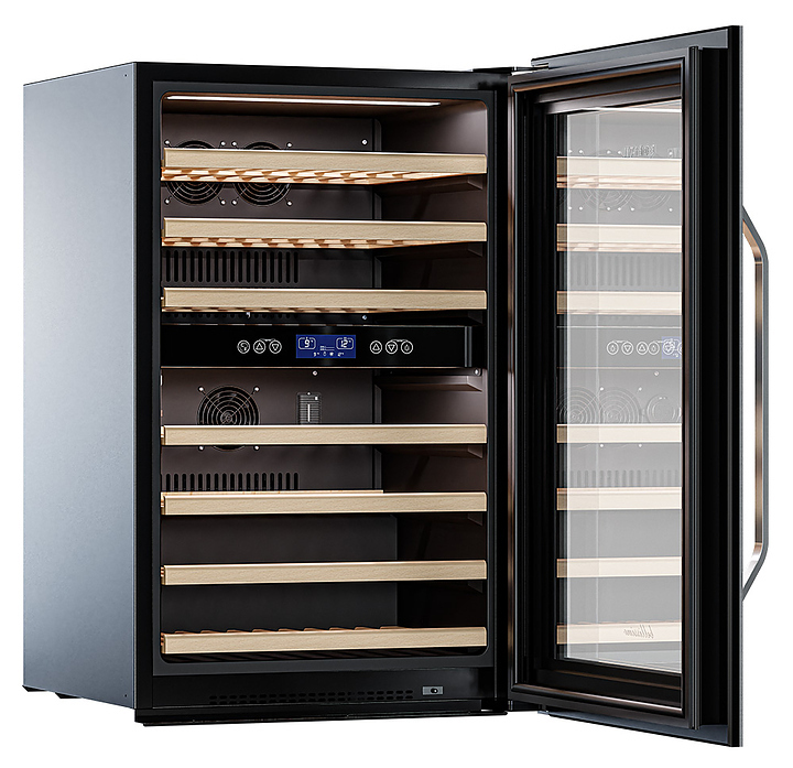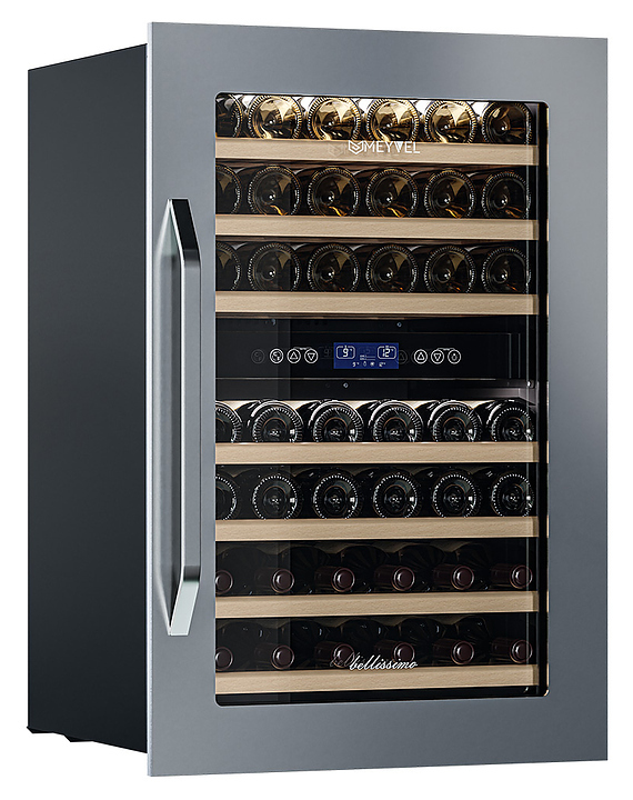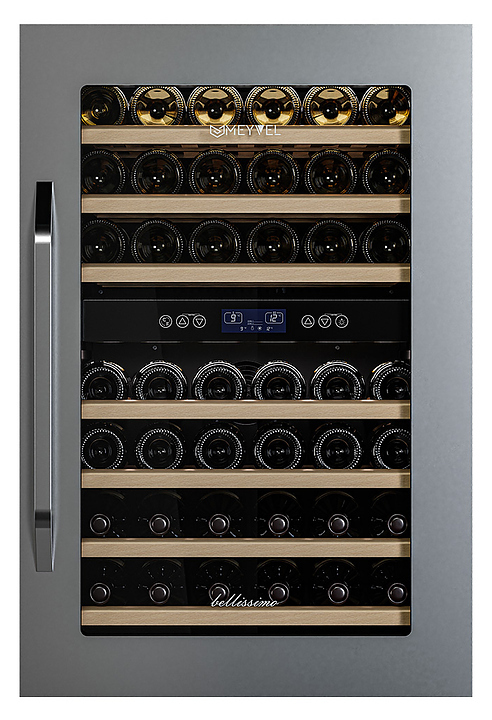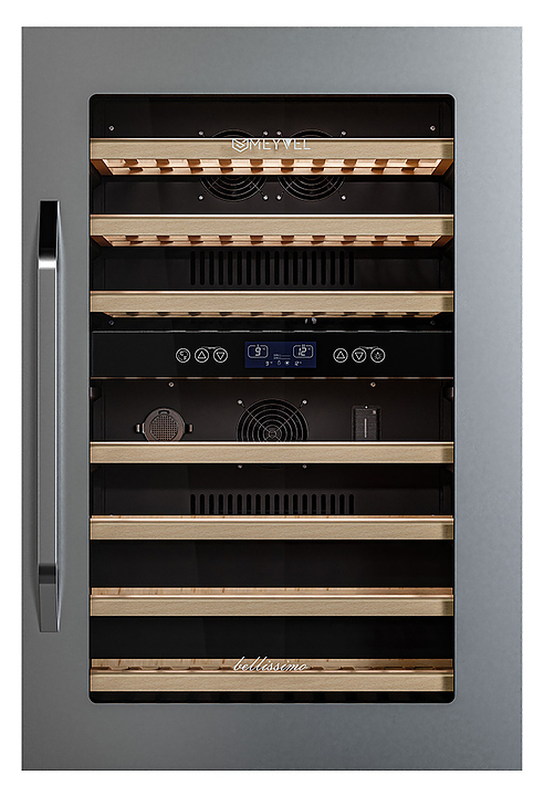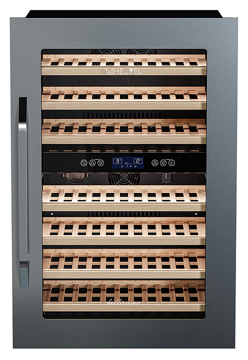 Винный шкаф MEYVEL MV42-KSB2 предназначен для демонстрации, хранения и создания оптимальных условий для сохранения всех вкусовых свойств вина в бутылках на предприятиях общественного питания, торговли, в барах, ресторанах, специализированных магазинах, частных домах или квартирах. Модель оснащена сенсорной панелью управления, 2 электронными термостатами и внутренней светодиодной подсветкой. Корпус выполнен из окрашенной в черный цвет стали, дверь - из двойного стекла с УФ защитой со стальной рамкой, полки - из массива бука.