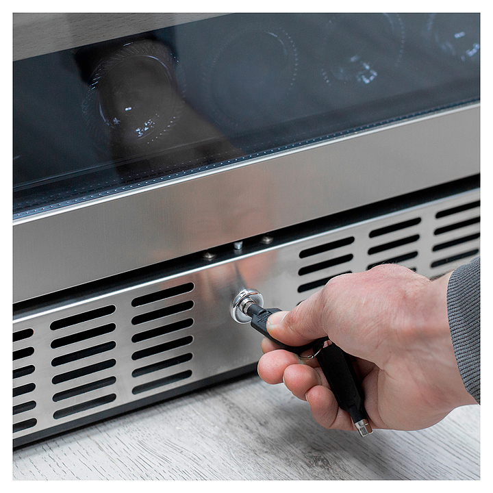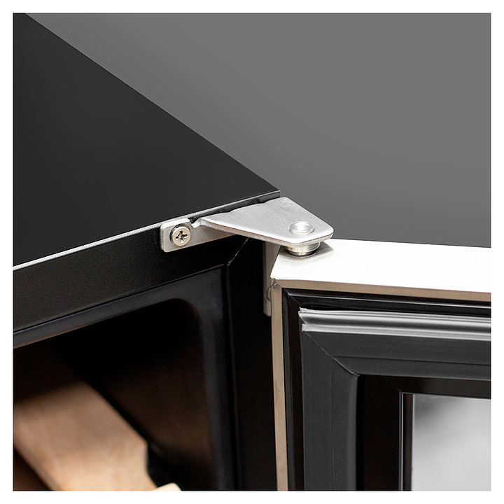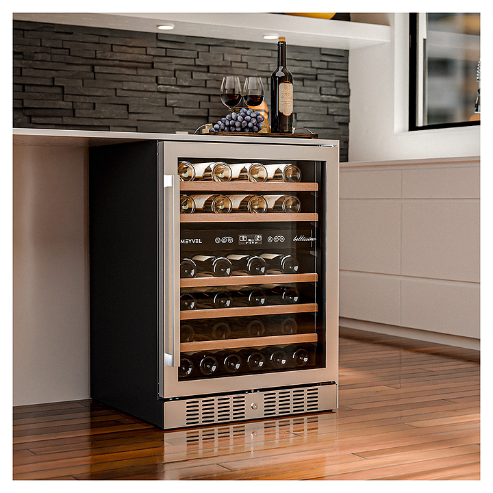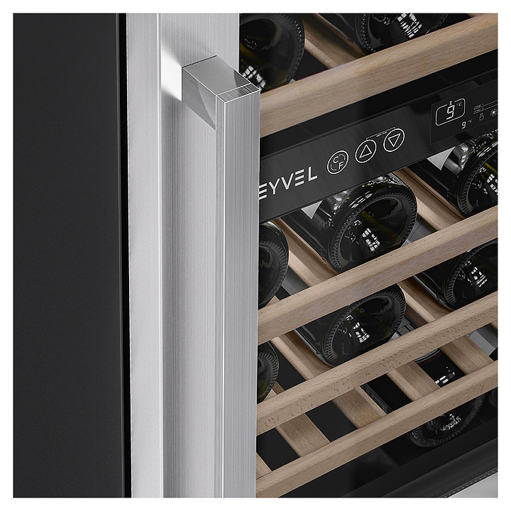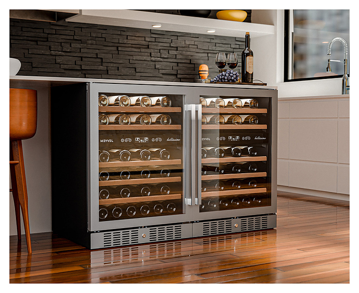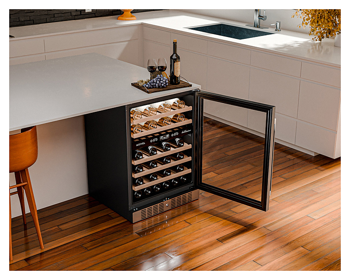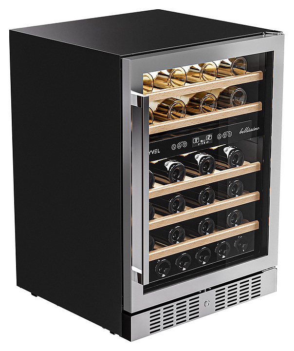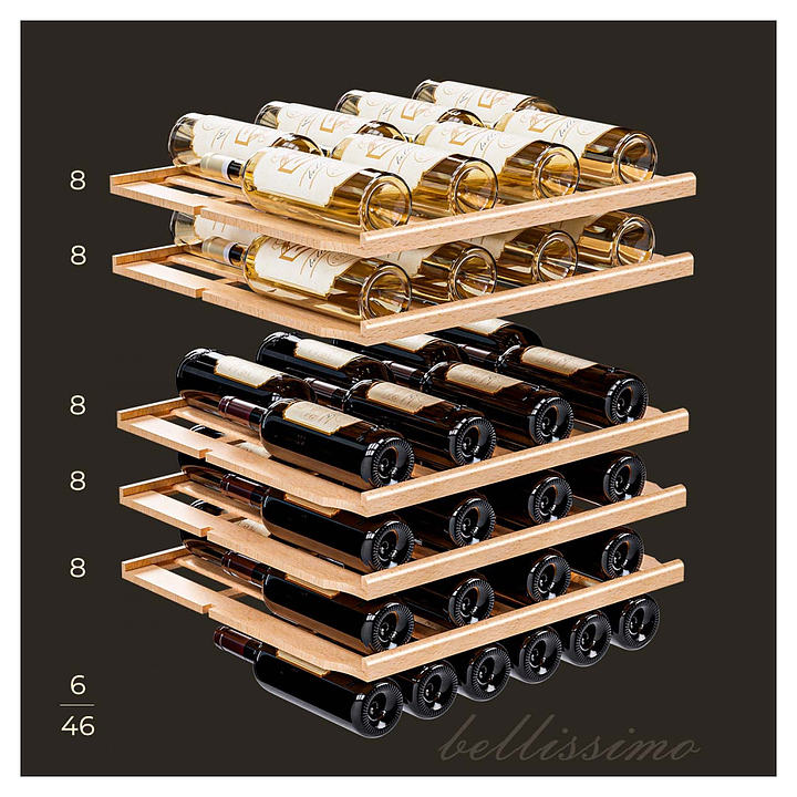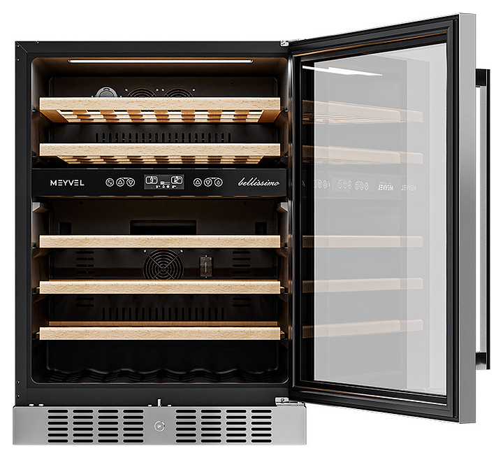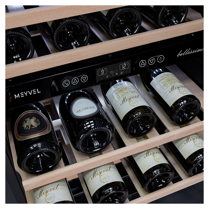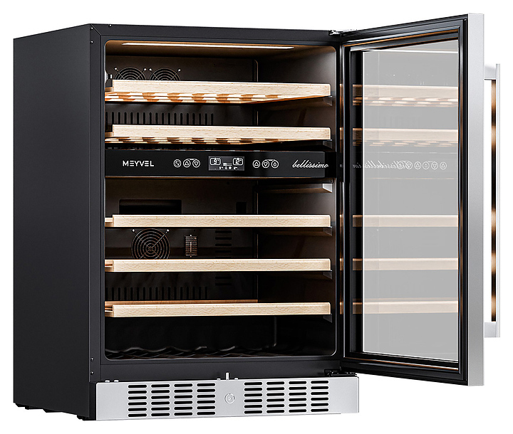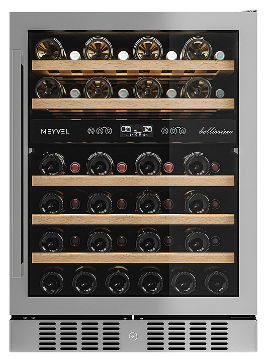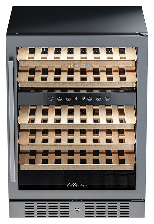 Винный шкаф MEYVEL MV46-KST2 предназначен для демонстрации, хранения и создания оптимальных условий для сохранения всех вкусовых свойств вина в бутылках на предприятиях общественного питания, торговли, в барах, ресторанах, специализированных магазинах, частных домах или квартирах. Модель оснащена сенсорной панелью управления, 2 электронными термостатами, замком и синей внутренней светодиодной подсветкой. Корпус выполнен из окрашенной в черный цвет стали, дверь - из двойного стекла с УФ защитой со стальной рамкой, полки - из массива бука.