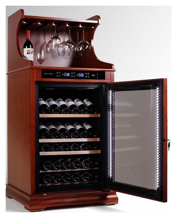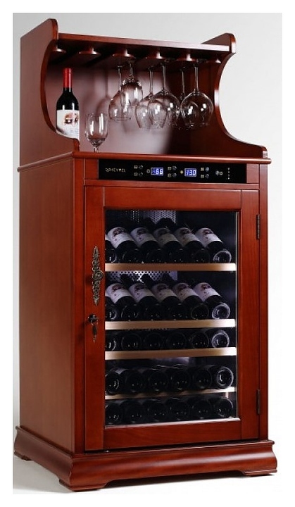 Винный шкаф MEYVEL MV46-WM1-BAR1.4-C предназначен для демонстрации, хранения и создания оптимальных условий для сохранения всех вкусовых свойств вина в бутылках на предприятиях общественного питания, торговли, в барах, ресторанах, специализированных магазинах, частных домах или квартирах. Модель оснащена электронной панелью управления, электронным термостатом и светодиодной подсветкой. Корпус выполнен из обшитой деревом стали, дверь - из деревянной рамы и тройного стекла с защитой от ультрафиолетовых лучей, полки - из массива бука, ручка двери - из стали.