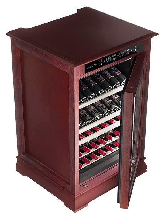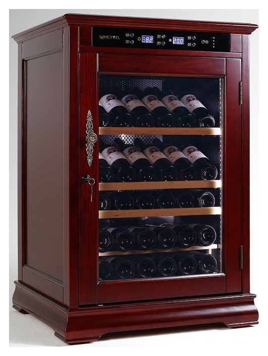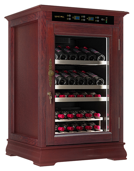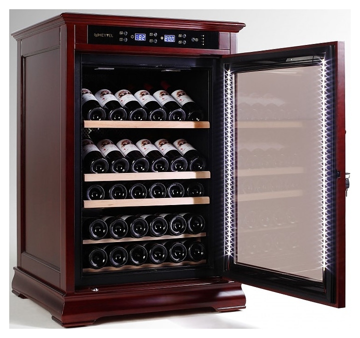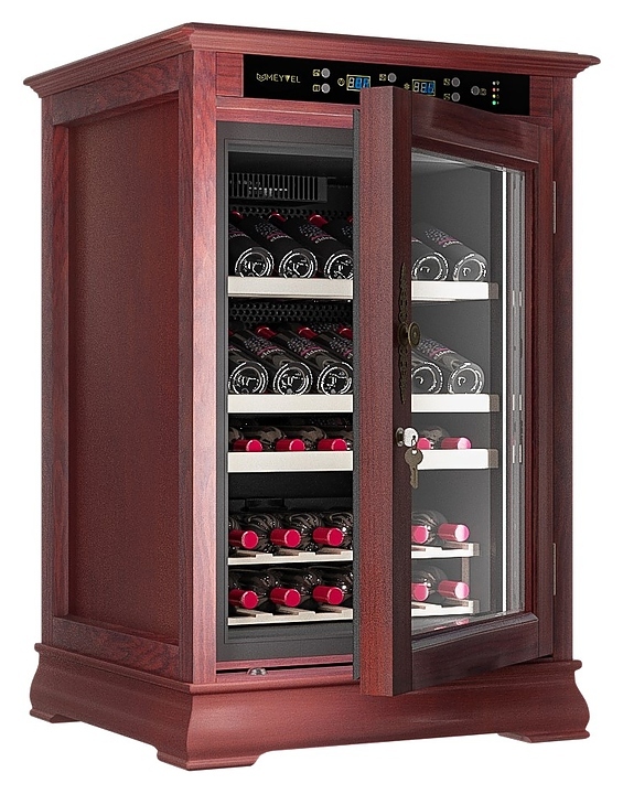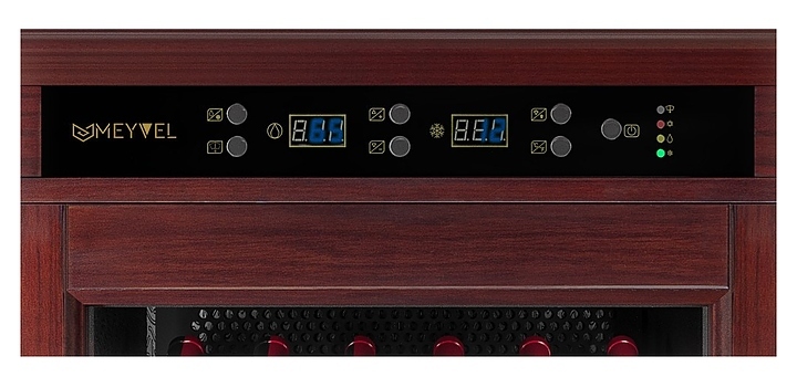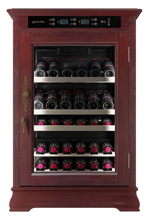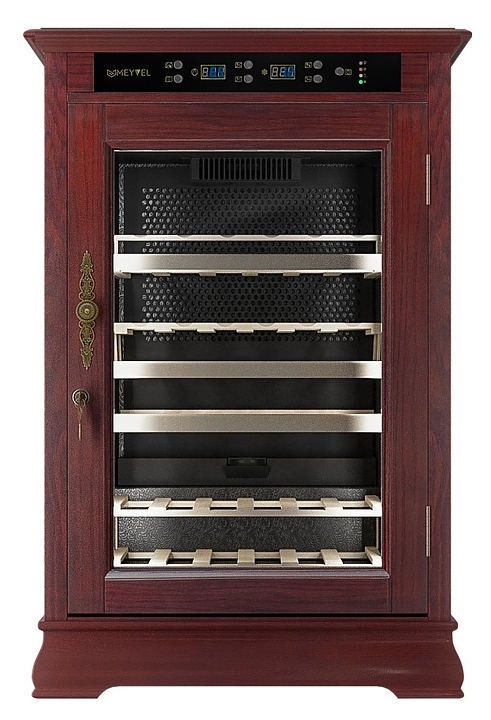 Винный шкаф MEYVEL MV46-WM1-C предназначен для демонстрации, хранения и создания оптимальных условий для сохранения всех вкусовых свойств вина в бутылках на предприятиях общественного питания, торговли, в барах, ресторанах, специализированных магазинах, частных домах или квартирах. Модель оснащена сенсорной панелью управления, электронным термостатом и светодиодной подсветкой. Корпус выполнен из обшитой деревом стали, дверь - из деревянной рамы и двойного стекла с защитой от ультрафиолетовых лучей, полки - из массива бука.