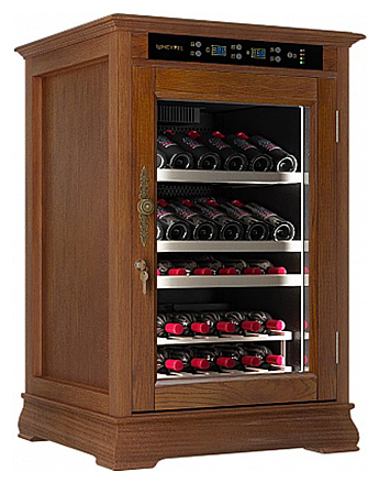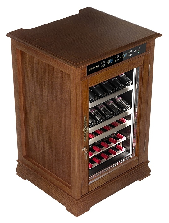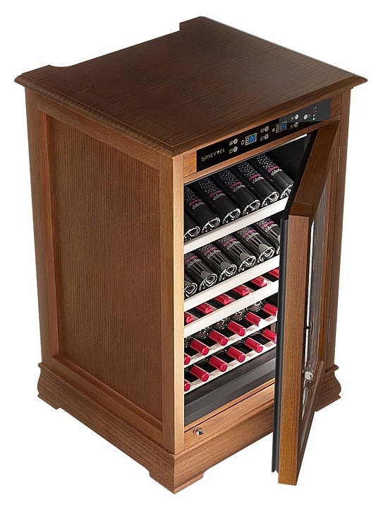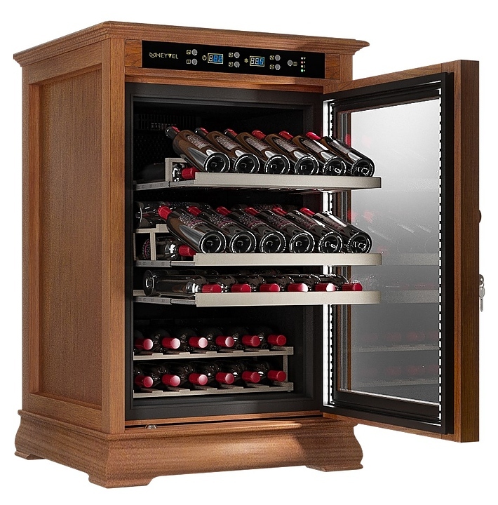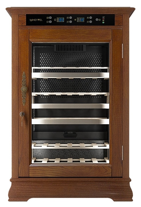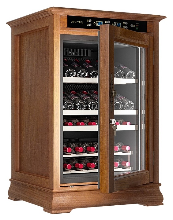 Винный шкаф MEYVEL MV46-WN1-C предназначен для демонстрации, хранения и создания оптимальных условий для сохранения всех вкусовых свойств вина в бутылках на предприятиях общественного питания, торговли, в барах, ресторанах, специализированных магазинах, частных домах или квартирах. Модель оснащена сенсорной панелью управления, электронным термостатом и светодиодной подсветкой. Корпус выполнен из обшитой деревом стали, дверь - из деревянной рамы и двойного стекла с защитой от ультрафиолетовых лучей, полки - из массива бука.