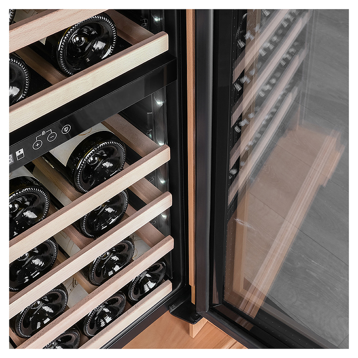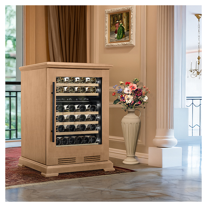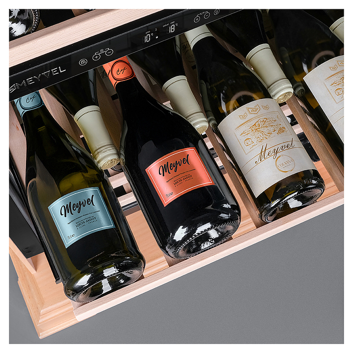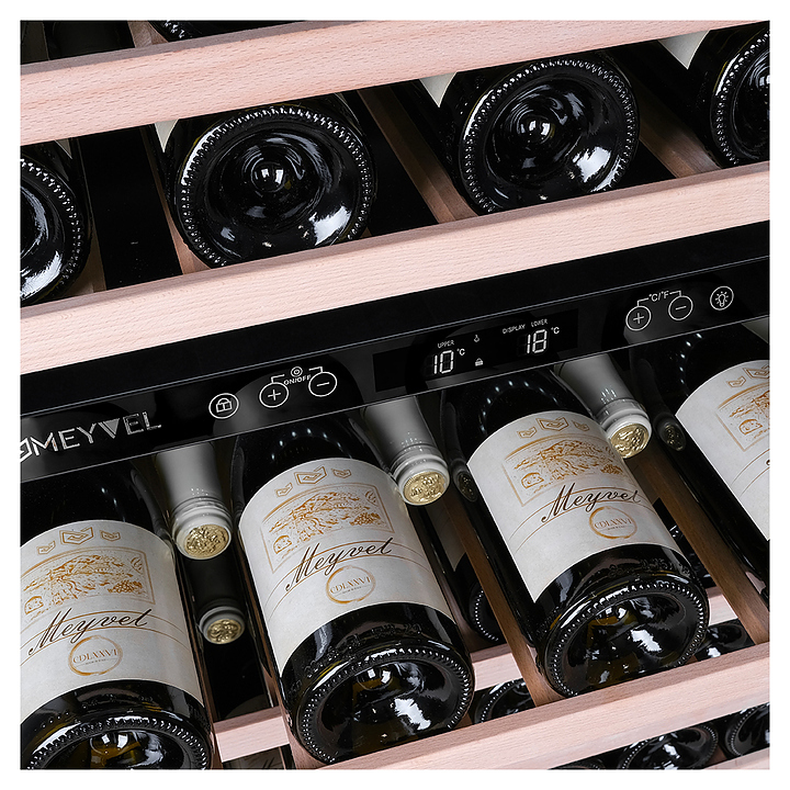 Винный шкаф MEYVEL MV46PRO-KBT2 предназначен для демонстрации, хранения и создания оптимальных условий для сохранения всех вкусовых свойств вина в бутылках на предприятиях общественного питания, торговли, в барах, ресторанах, специализированных магазинах, частных домах или квартирах. Модель оснащена сенсорной панелью управления и внутренней светодиодной подсветкой. Корпус выполнен из стали с обшивкой из дерева, дверь - из тройного стекла с УФ защитой, полки - из массива бука.