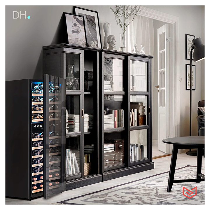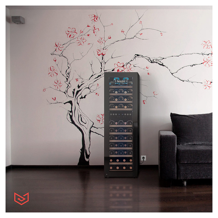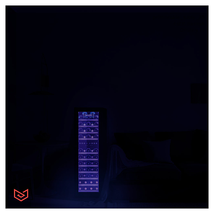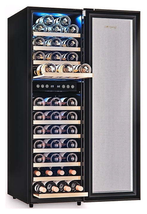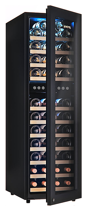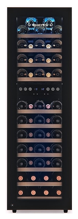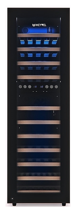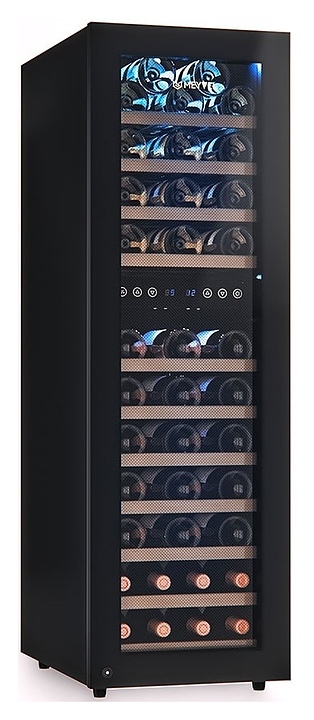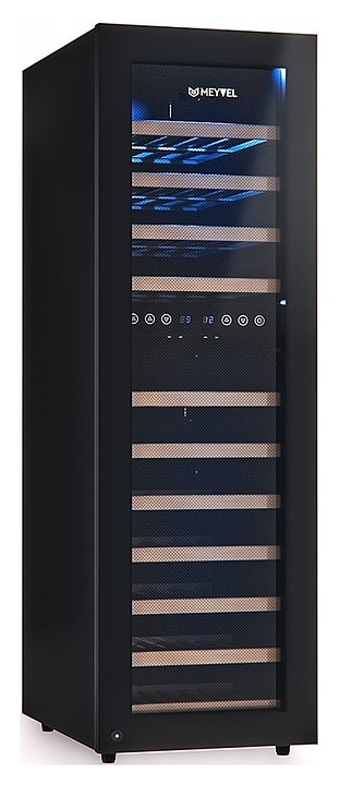 Винный шкаф MEYVEL MV53-KBF2 предназначен для демонстрации, хранения и создания оптимальных условий для сохранения всех вкусовых свойств вина в бутылках на предприятиях общественного питания, торговли, в барах, ресторанах, специализированных магазинах, частных домах или квартирах. Модель оснащена сенсорной панелью управления, электронным термостатом и светодиодной подсветкой синего цвета в каждой зоне. Корпус выполнен из окрашенной в черный цвет стали, дверь - из черной рамы и тонированного стекла с защитой от ультрафиолетовых лучей, полки - из массива бука.