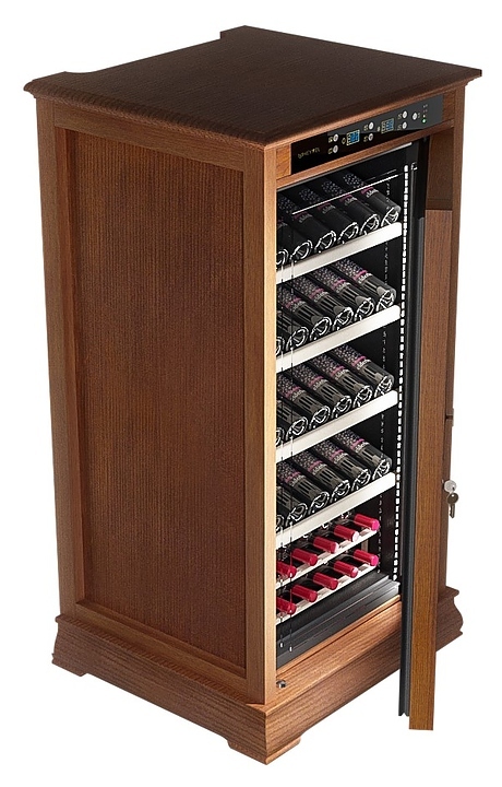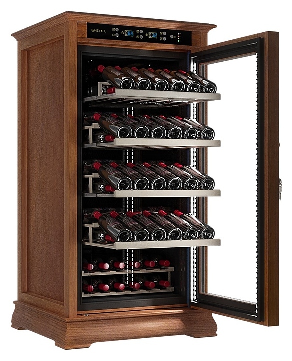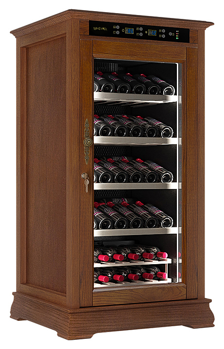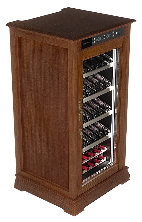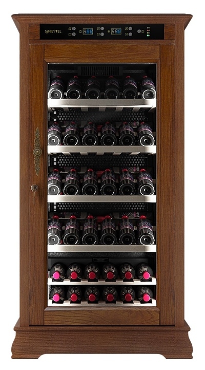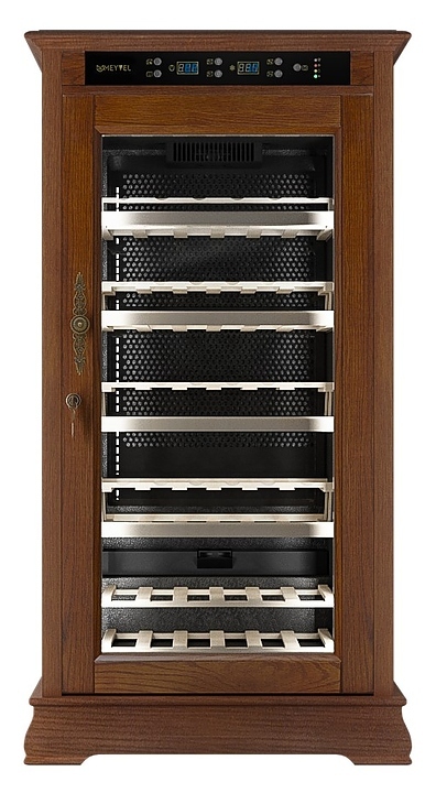Винный шкаф MEYVEL MV66-WN1-C предназначен для демонстрации, хранения и создания оптимальных условий для сохранения всех вкусовых свойств вина в бутылках на предприятиях общественного питания, торговли, в барах, ресторанах, специализированных магазинах, частных домах или квартирах. Модель оснащена сенсорной панелью управления, электронным термостатом и светодиодной подсветкой. Корпус выполнен из обшитой деревом стали, дверь - из деревянной рамы и двойного стекла с защитой от ультрафиолетовых лучей, полки - из массива бука, ручка двери - из стали.