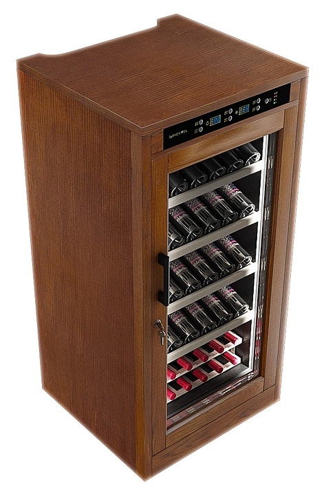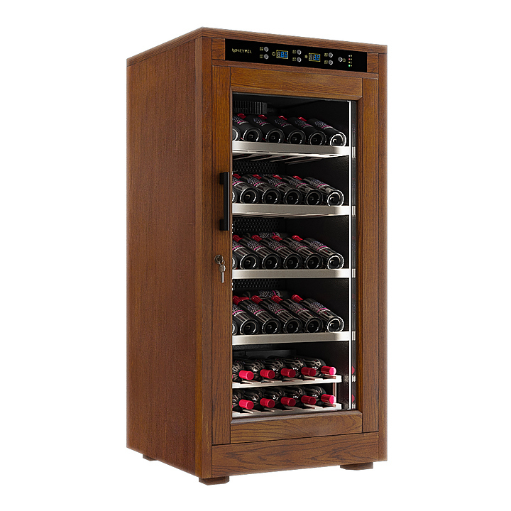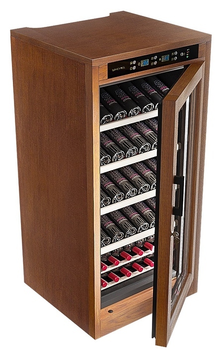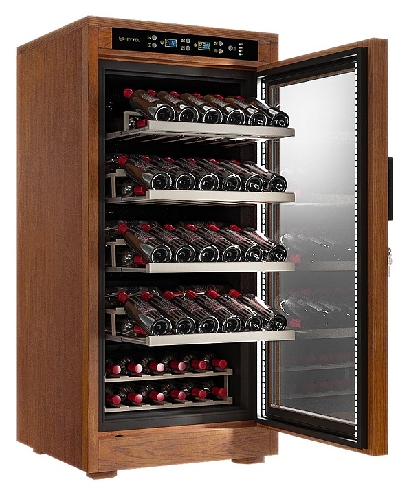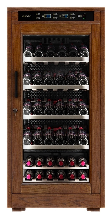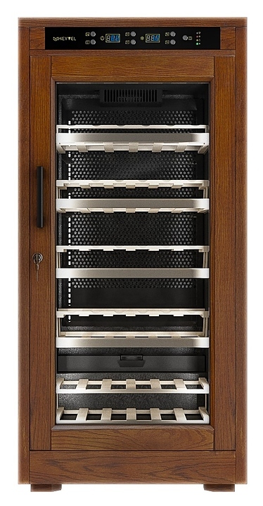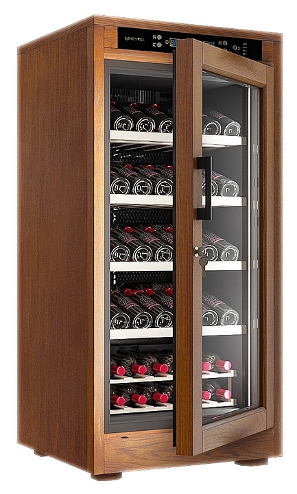 Винный шкаф MEYVEL MV66-WN1-C предназначен для демонстрации, хранения и создания оптимальных условий для сохранения всех вкусовых свойств вина в бутылках на предприятиях общественного питания, торговли, в барах, ресторанах, специализированных магазинах, частных домах или квартирах. Модель оснащена сенсорной панелью управления, электронным термостатом и светодиодной подсветкой. Корпус выполнен из обшитой деревом стали, дверь - из деревянной рамы и двойного стекла с защитой от ультрафиолетовых лучей, полки - из массива бука, ручка двери - черного цвета.