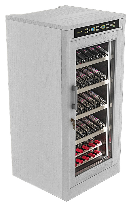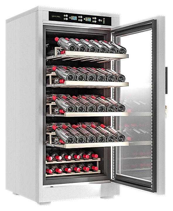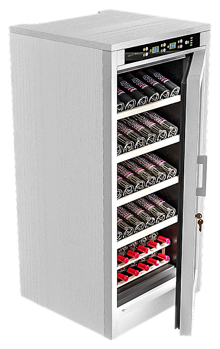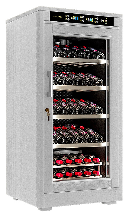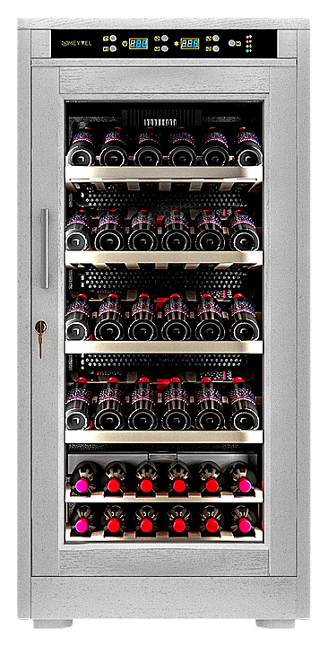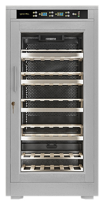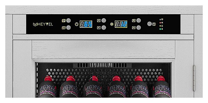Винный шкаф MEYVEL MV66-WW1-M предназначен для демонстрации, хранения и создания оптимальных условий для сохранения всех вкусовых свойств вина в бутылках на предприятиях общественного питания, торговли, в барах, ресторанах, специализированных магазинах, частных домах или квартирах. Модель оснащена сенсорной панелью управления, электронным термостатом и светодиодной подсветкой. Корпус выполнен из обшитой белым американским дубом стали, дверь - из деревянной рамы и двойного стекла с защитой от ультрафиолетовых лучей, полки - из массива бука, ручка двери - из стали.