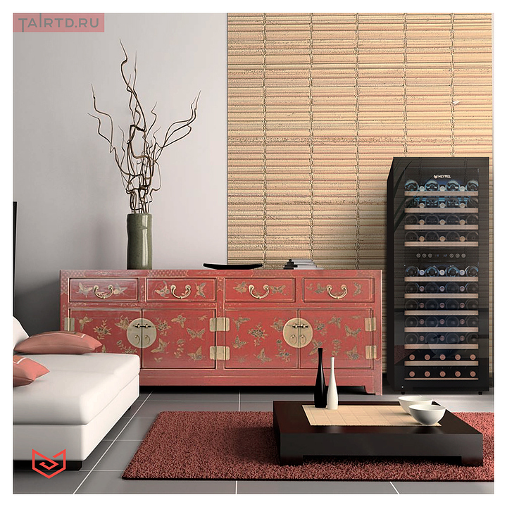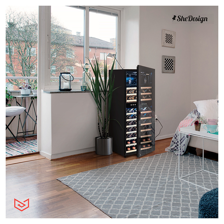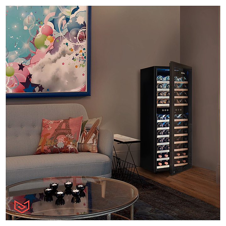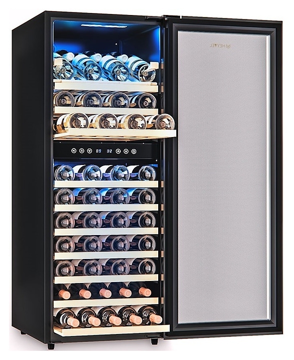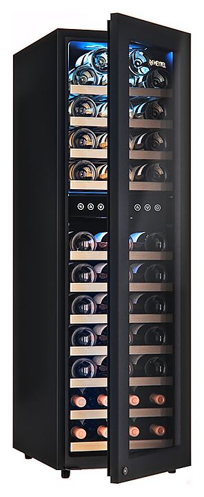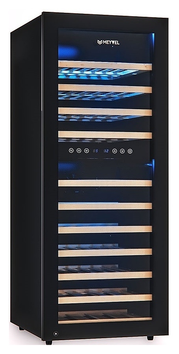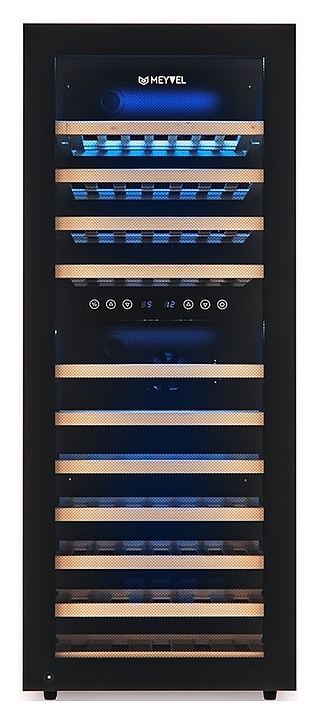 Винный шкаф MEYVEL MV73-KBF2 предназначен для демонстрации, хранения и создания оптимальных условий для сохранения всех вкусовых свойств вина в бутылках на предприятиях общественного питания, торговли, в барах, ресторанах, специализированных магазинах, частных домах или квартирах. Модель оснащена сенсорной панелью управления, электронным термостатом и светодиодной подсветкой синего цвета в каждой зоне. Корпус выполнен из окрашенной в черный цвет стали, дверь - из черной рамы и тонированного стекла с защитой от ультрафиолетовых лучей, полки - из массива бука.