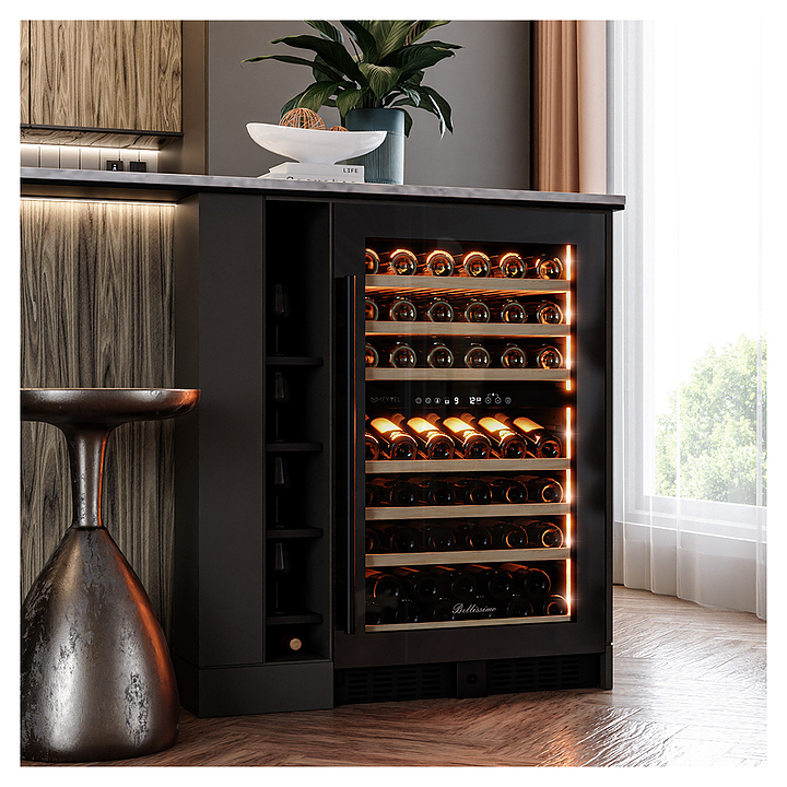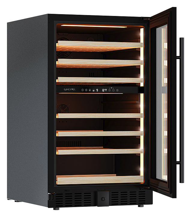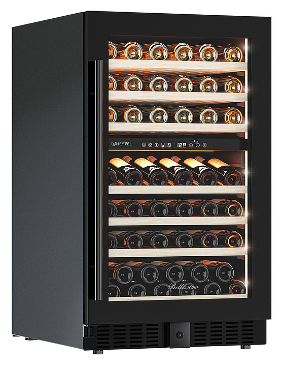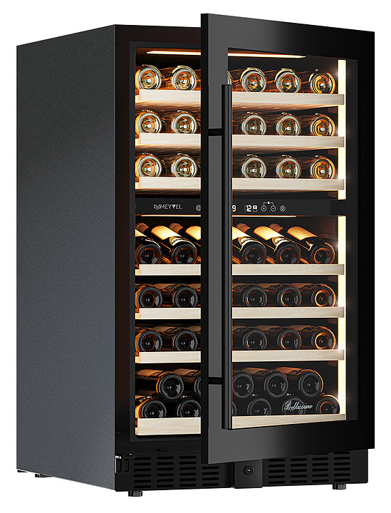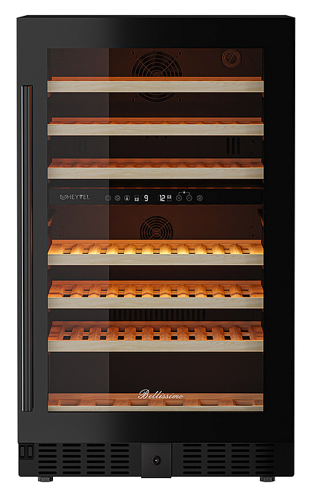 Винный шкаф MEYVEL MV77PRO-KBT2 предназначен для демонстрации, хранения и создания оптимальных условий для сохранения всех вкусовых свойств вина в бутылках на предприятиях общественного питания, торговли, в барах, ресторанах, специализированных магазинах, частных домах или квартирах. Модель оснащена сенсорной панелью управления, 2 электронными термостатами и внутренней светодиодной подсветкой. Корпус и дверная ручка выполнены из окрашенной в черный цвет стали, дверь - из тройного стекла с УФ защитой с черной рамкой, полки - из массива бука.