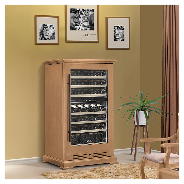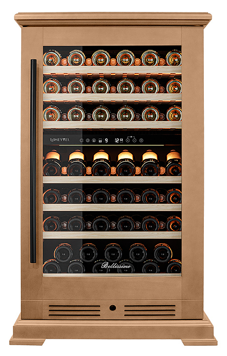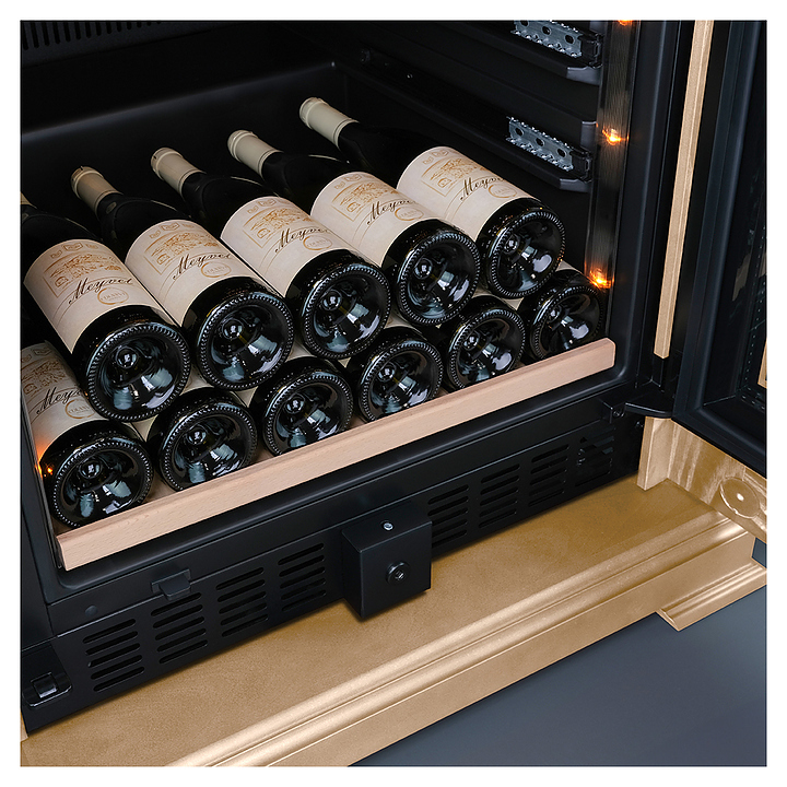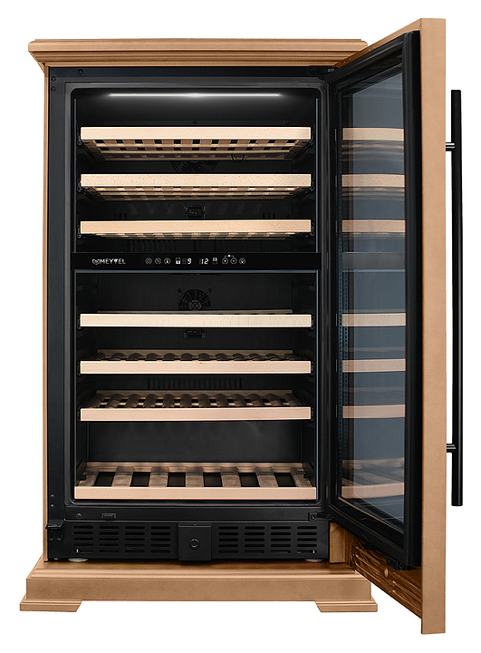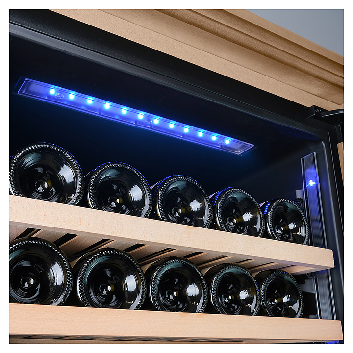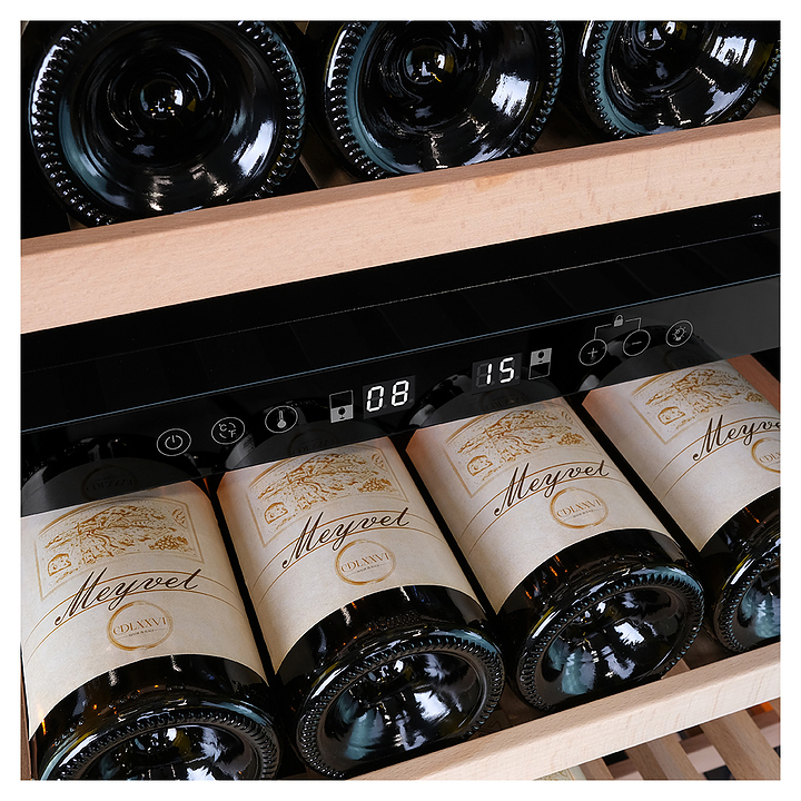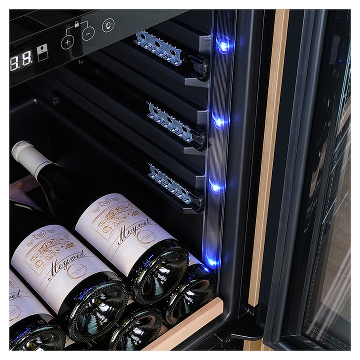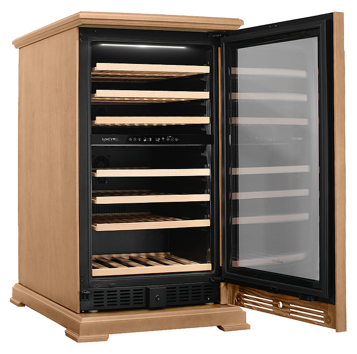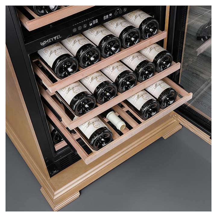 Винный шкаф MEYVEL MV77PRO-KBT2 предназначен для демонстрации, хранения и создания оптимальных условий для сохранения всех вкусовых свойств вина в бутылках на предприятиях общественного питания, торговли, в барах, ресторанах, специализированных магазинах, частных домах или квартирах. Модель оснащена интуитивно-понятной сенсорной панелью управления, электронным термостатом и внутренней светодиодной подсветкой. Корпус выполнен из стали с обшивкой из натурального шпона бука, дверь - из тройного стекла с УФ защитой, полки - из массива бука.