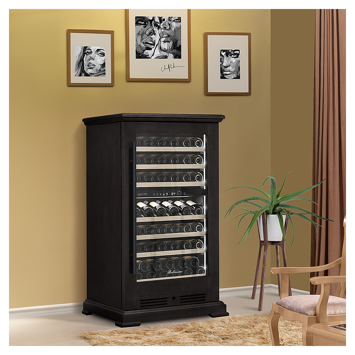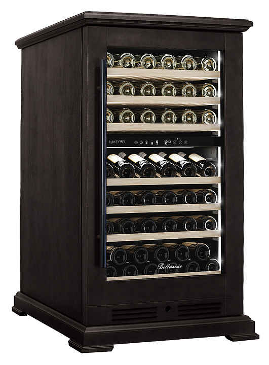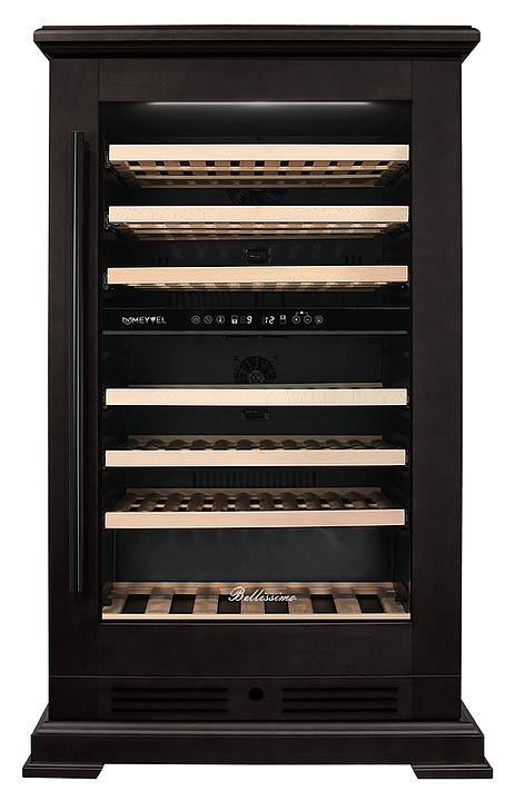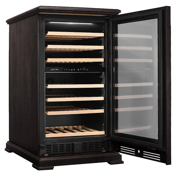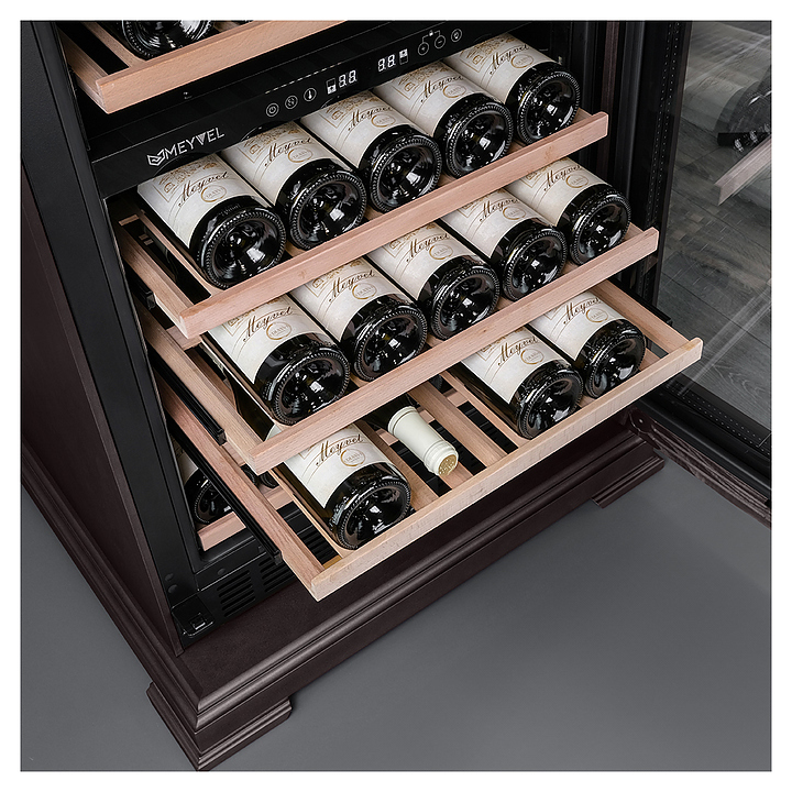 Винный шкаф MEYVEL MV77PRO-KBT2 предназначен для демонстрации, хранения и создания оптимальных условий для сохранения всех вкусовых свойств вина в бутылках на предприятиях общественного питания, торговли, в барах, ресторанах, специализированных магазинах, частных домах или квартирах. Модель оснащена интуитивно-понятной сенсорной панелью управления, электронным термостатом и внутренней светодиодной подсветкой. Корпус выполнен из стали с обшивкой из натурального шпона бука, дверь - из тройного стекла с УФ защитой, полки - из массива бука.