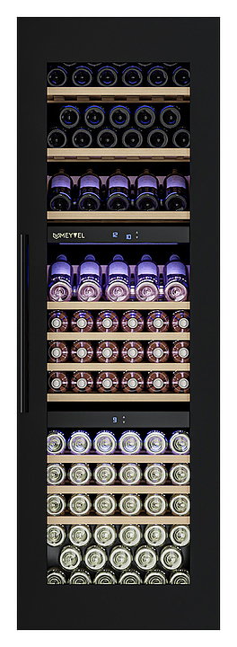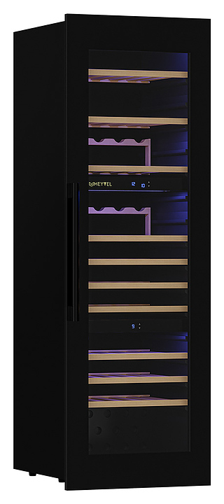 Винный шкаф MEYVEL MV89-KBВ3 предназначен для демонстрации, хранения и создания оптимальных условий для сохранения всех вкусовых свойств вина в бутылках на предприятиях общественного питания, торговли, в барах, ресторанах, специализированных магазинах, частных домах или квартирах. Модель оснащена сенсорной панелью управления, электронным термостатом и внутренней синей светодиодной подсветкой. Корпус и дверная ручка выполнены из окрашенной в черный цвет стали, дверь - из двойного стекла с УФ защитой с черной рамкой, полки - из массива бука.