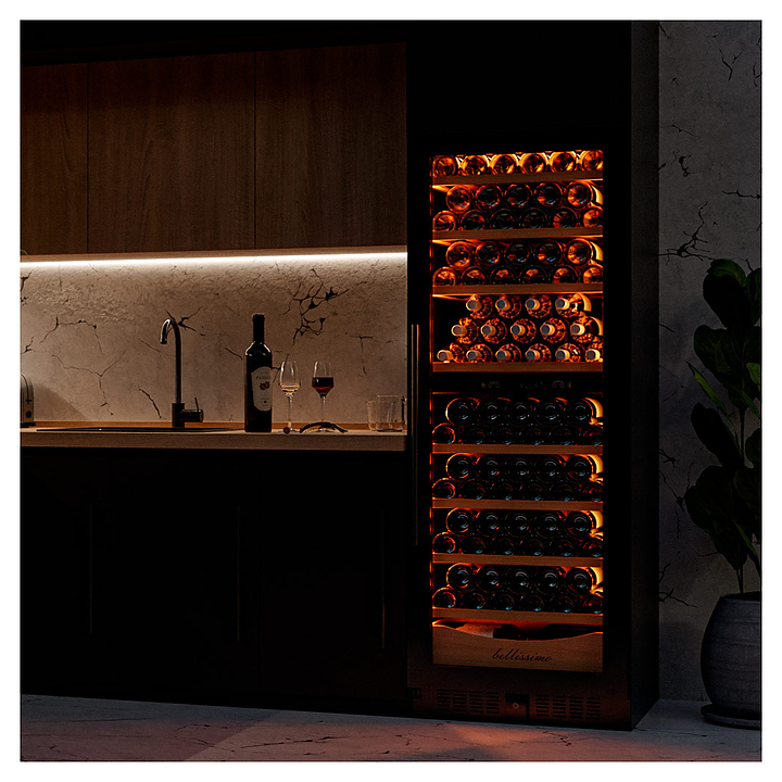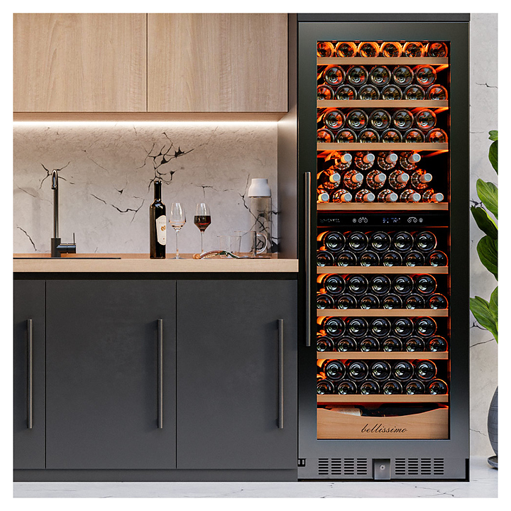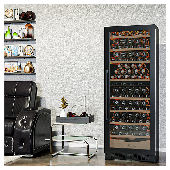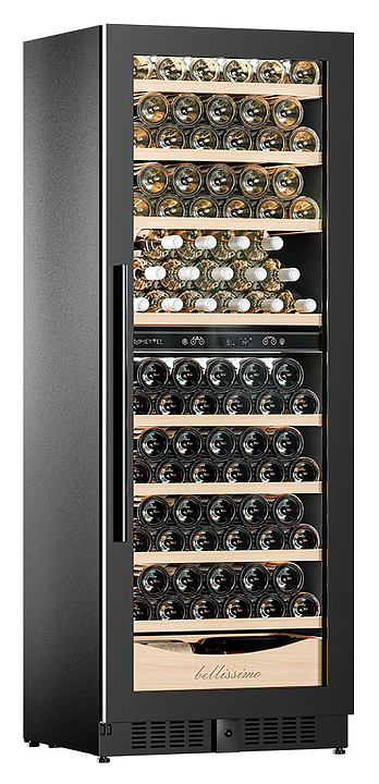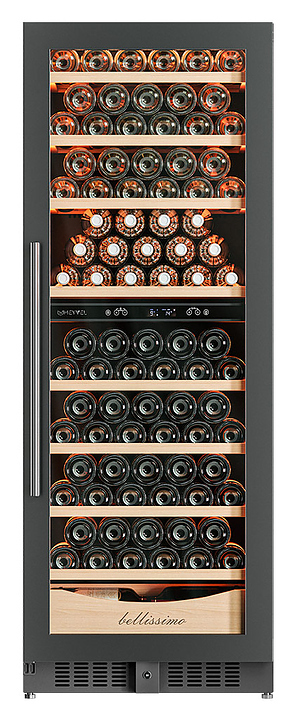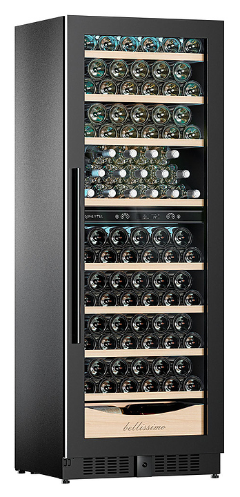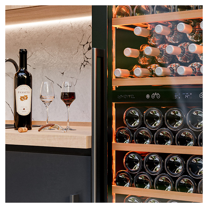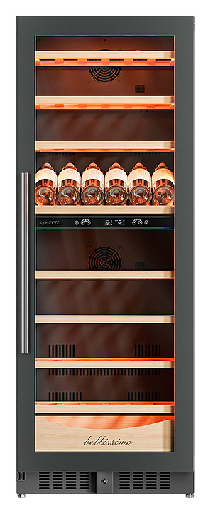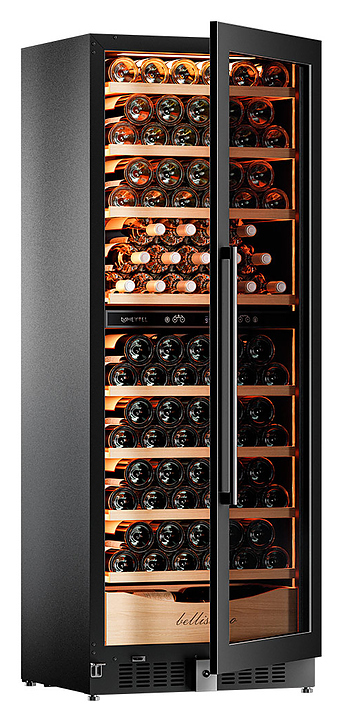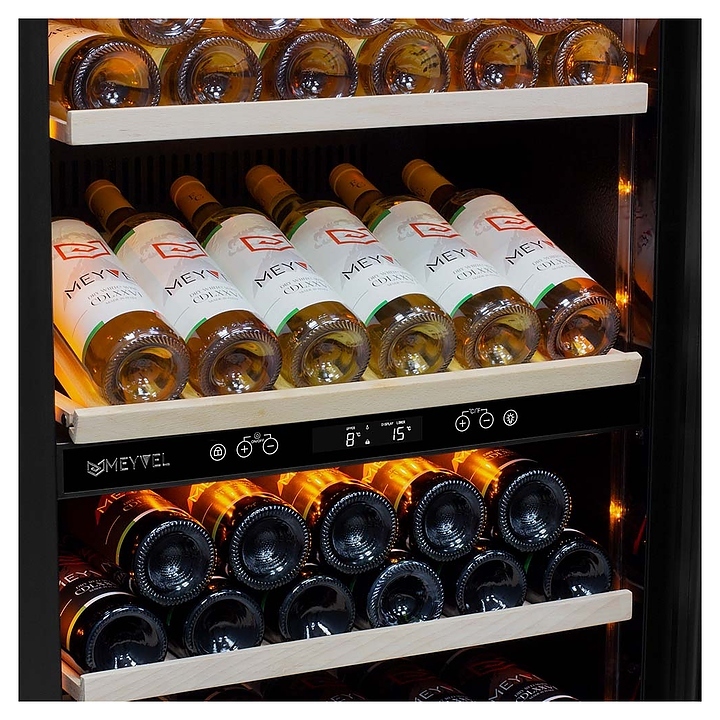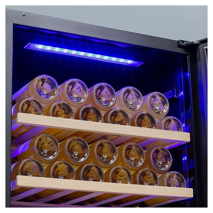 Винный шкаф MEYVEL MV95-KBT2 (Slim) предназначен для демонстрации, хранения и создания оптимальных условий для сохранения всех вкусовых свойств вина в бутылках на предприятиях общественного питания, торговли, в барах, ресторанах, специализированных магазинах, частных домах или квартирах. Модель оснащена сенсорной панелью управления, электронным термостатом и внутренней светодиодной подсветкой. Корпус и дверная ручка выполнены из окрашенной в черный цвет стали, дверь - из тройного стекла с УФ защитой с черной рамкой, полки - из массива бука.