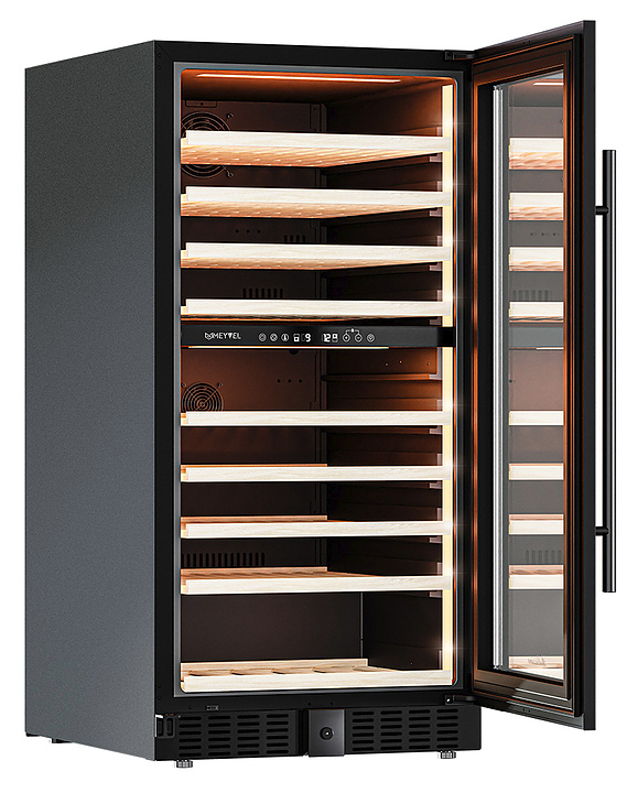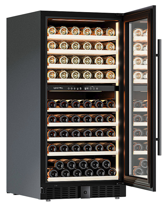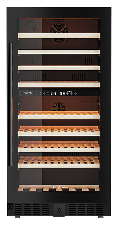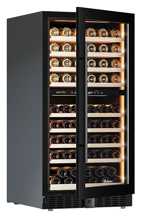 Винный шкаф MEYVEL MV99PRO-KBT2 предназначен для демонстрации, хранения и создания оптимальных условий для сохранения всех вкусовых свойств вина в бутылках на предприятиях общественного питания, торговли, в барах, ресторанах, специализированных магазинах, частных домах или квартирах. Модель оснащена сенсорной панелью управления, 2 электронными термостатами и внутренней светодиодной подсветкой. Корпус и дверная ручка выполнены из окрашенной в черный цвет стали, дверь - из тройного стекла с УФ защитой с черной рамкой, полки - из массива бука.