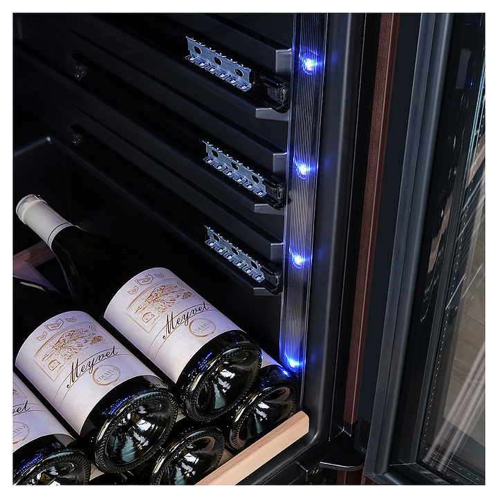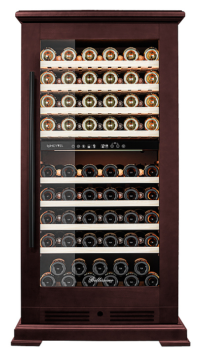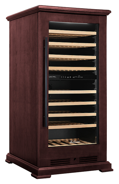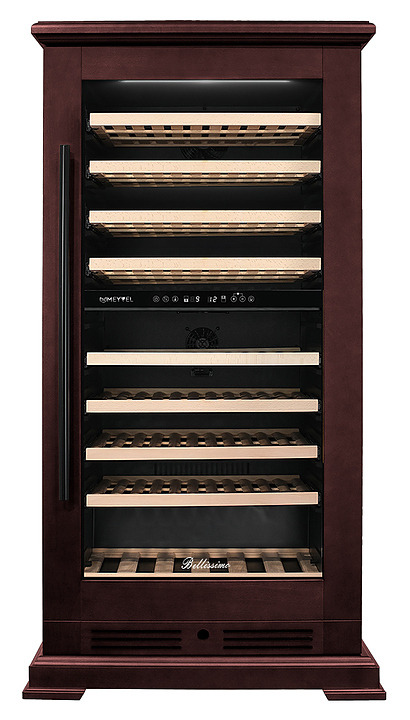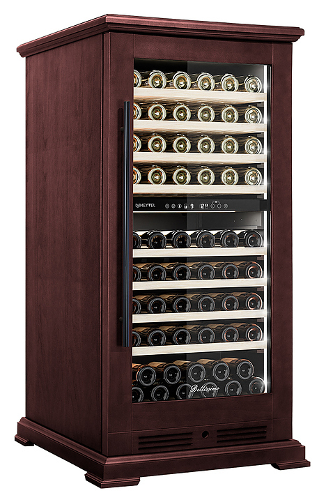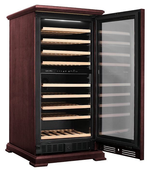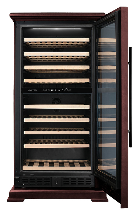 Винный шкаф MEYVEL MV99PRO-KBT2 предназначен для демонстрации, хранения и создания оптимальных условий для сохранения всех вкусовых свойств вина в бутылках на предприятиях общественного питания, торговли, в барах, ресторанах, специализированных магазинах, частных домах или квартирах. Модель оснащена интуитивно-понятной сенсорной панелью управления, электронным термостатом и внутренней светодиодной подсветкой. Корпус выполнен из стали с обшивкой из натурального шпона бука, дверь - из тройного стекла с УФ защитой, полки - из массива бука.
