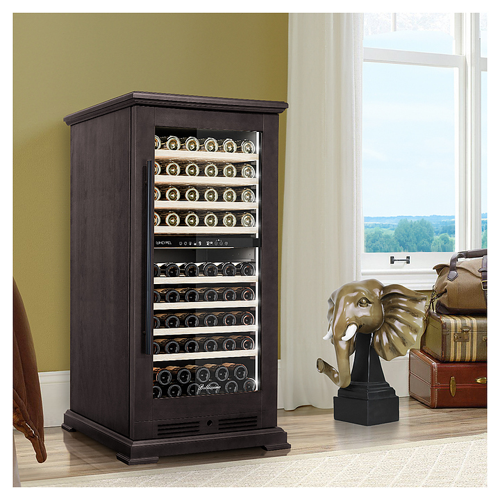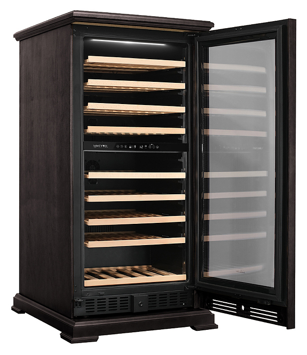 Винный шкаф MEYVEL MV99PRO-KBT2 предназначен для демонстрации, хранения и создания оптимальных условий для сохранения всех вкусовых свойств вина в бутылках на предприятиях общественного питания, торговли, в барах, ресторанах, специализированных магазинах, частных домах или квартирах. Модель оснащена интуитивно-понятной сенсорной панелью управления, электронным термостатом и внутренней светодиодной подсветкой. Корпус выполнен из стали с обшивкой из натурального шпона бука, дверь - из тройного стекла с УФ защитой, полки - из массива бука.