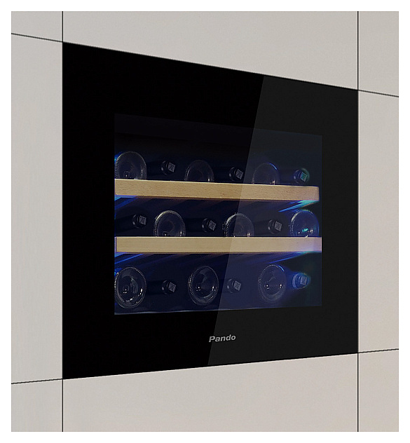 Винный шкаф Pando PVMAV 45-18 CRL предназначен для хранения при оптимальных условиях и предпродажной демонстрации бутилированного вина различных сортов в барах, ресторанах, специализированных магазинах, подсобных складских помещениях, а также домашних условиях. Модель оснащена монотемпературной холодильной камерой с левосторонней распашной дверью, вертикальной рукояткой, внутренней сенсорной панелью управления и светодиодным цифровым дисплеем с голубой подсветкой индикации. Корпус выполнен из стали с антикоррозийным покрытием черного цвета, дверь с полным фронтальным остеклением без винтового крепежа из закаленного стекла с прозрачной дымчатой тонировкой, рукоятка – из анодированного алюминия с черной поверхностью, внутренняя облицовка камеры черного цвета, полки – из массива буковой древесины.