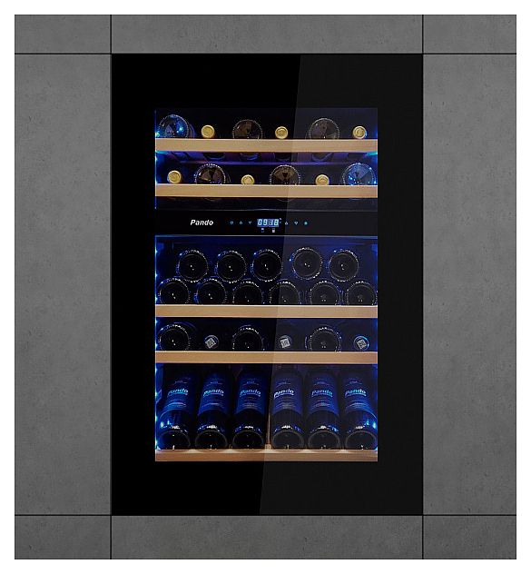 Винный шкаф Pando PVMAV 88-49 CRR предназначен для хранения при оптимальных условиях и предпродажной демонстрации бутилированного вина различных сортов в барах, ресторанах, специализированных магазинах, подсобных складских помещениях, а также домашних условиях. Модель оснащена холодильной камерой с 2 температурными зонами, правосторонней распашной дверью, вертикальной рукояткой, внутренней сенсорной панелью управления и светодиодными цифровыми дисплеями с голубой подсветкой индикации. Корпус выполнен из стали с антикоррозийным покрытием черного цвета, дверь с полным фронтальным остеклением без винтового крепежа из закаленного стекла с прозрачной дымчатой тонировкой, рукоятка – из анодированного алюминия с черной поверхностью, внутренняя облицовка камеры черного цвета, полки – из массива буковой древесины.