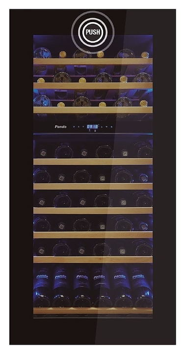 Винный шкаф Pando PVMAVP 124-70 CRL предназначен для хранения при оптимальных условиях и предпродажной демонстрации бутилированного вина различных сортов в барах, ресторанах, специализированных магазинах, подсобных складских помещениях, а также домашних условиях. Модель оснащена холодильной камерой с 2 температурными зонами, левосторонней распашной дверью, внутренней сенсорной панелью управления и светодиодными цифровыми дисплеями с голубой подсветкой индикации. Корпус выполнен из стали с антикоррозийным покрытием черного цвета, дверь с полным фронтальным остеклением без винтового крепежа из закаленного стекла с прозрачной дымчатой тонировкой, внутренняя облицовка камеры черного цвета, полки – из массива буковой древесины.