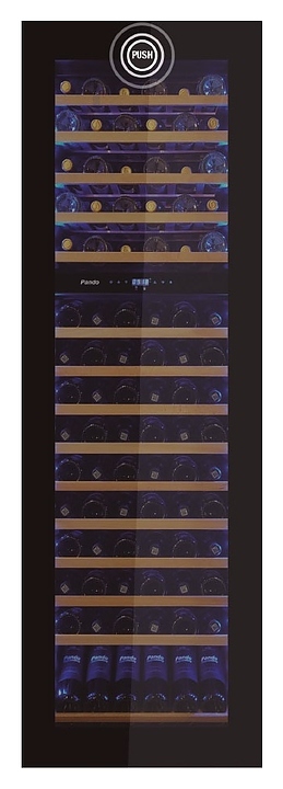 Винный шкаф Pando PVMAVP 178-112 CRR предназначен для хранения при оптимальных условиях и предпродажной демонстрации бутилированного вина различных сортов в барах, ресторанах, специализированных магазинах, подсобных складских помещениях, а также домашних условиях. Модель оснащена холодильной камерой с 2 температурными зонами, правосторонней распашной дверью, внутренней сенсорной панелью управления и светодиодными цифровыми дисплеями с голубой подсветкой индикации. Корпус выполнен из стали с антикоррозийным покрытием черного цвета, дверь с полным фронтальным остеклением без винтового крепежа из закаленного стекла с прозрачной дымчатой тонировкой, внутренняя облицовка камеры черного цвета, полки – из массива буковой древесины.