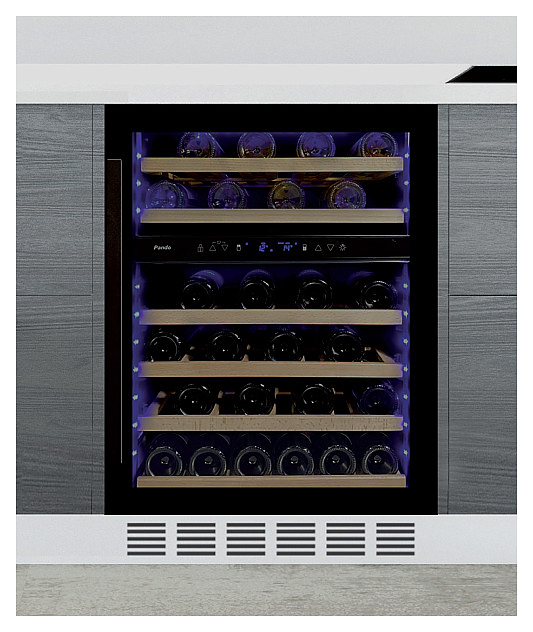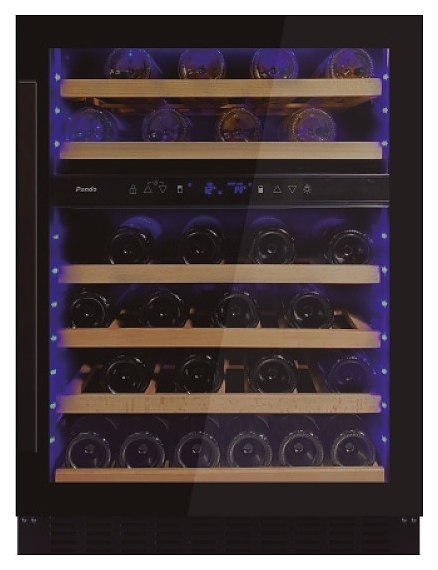 Винный шкаф Pando PVZB 60-46 CRL предназначен для хранения при оптимальных условиях и предпродажной демонстрации бутилированного вина различных сортов в барах, ресторанах, специализированных магазинах, подсобных складских помещениях, а также домашних условиях. Модель оснащена холодильной камерой с 2 температурными зонами, левосторонней распашной дверью, вертикальной рукояткой, внутренней сенсорной панелью управления и светодиодными цифровыми дисплеями с голубой подсветкой индикации. Корпус выполнен из стали с антикоррозийным покрытием черного цвета, дверь с полным фронтальным остеклением без винтового крепежа из закаленного стекла с прозрачной дымчатой тонировкой, рукоятка – из анодированного алюминия с черной поверхностью, внутренняя облицовка камеры черного цвета, полки – из массива буковой древесины.