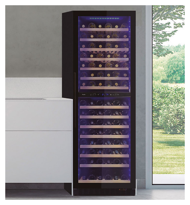 Винный шкаф Pando PVZL 180-165 CRR предназначен для хранения при оптимальных условиях и предпродажной демонстрации бутилированного вина различных сортов в барах, ресторанах, специализированных магазинах, подсобных складских помещениях, а также домашних условиях. Модель оснащена холодильной камерой с 2 температурными зонами правосторонней распашной дверью, вертикальной рукояткой, внутренней сенсорной панелью управления и светодиодными цифровыми дисплеями с голубой подсветкой индикации. Корпус выполнен из стали с антикоррозийным покрытием черного цвета, дверь с полным фронтальным остеклением без винтового крепежа из закаленного стекла с прозрачной дымчатой тонировкой, рукоятка – из анодированного алюминия с черной поверхностью, внутренняя облицовка камеры черного цвета, полки – из массива буковой древесины.