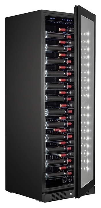 Винный шкаф Temptech Copenhagen CPRO1800SRB предназначен для охлаждения, хранения при оптимальных условиях и демонстрации бутилированного вина различных сортов в барах, ресторанах, специализированных магазинах, подсобных складских помещениях, а также домашних условиях. Модель оснащена монотемпературной холодильной камерой с 12 выдвижными полками на телескопических направляющих, фронтальной цокольной решеткой и распашной дверью с прозрачным обзорным остеклением. Корпус и рама двери выполнены из металла с антикоррозийным покрытием черного цвета, полки – из стали.