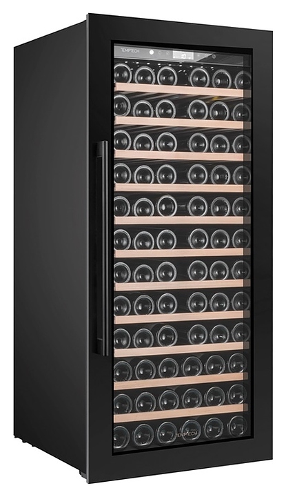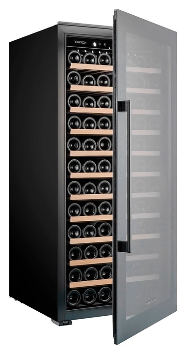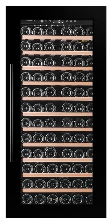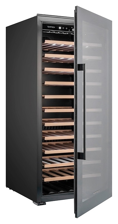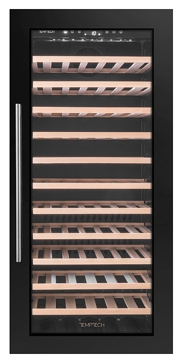 Винный шкаф Temptech Oslo OBI124SB предназначен для охлаждения, хранения при оптимальных условиях и демонстрации бутилированного вина различных сортов в барах, ресторанах, специализированных магазинах, подсобных складских помещениях, а также домашних условиях. Модель оснащена монотемпературной холодильной камерой с 11 выдвижными полками, распашной дверью на перенавешиваемых петлях, длинной вертикальной рукояткой и прозрачным обзорным остеклением. Корпус, рама двери и рукоятка выполнены из металла с антикоррозийным покрытием черного цвета, полки – из массива буковой древесины.