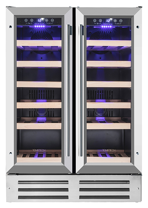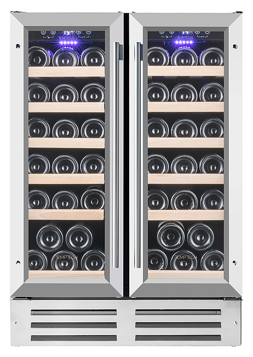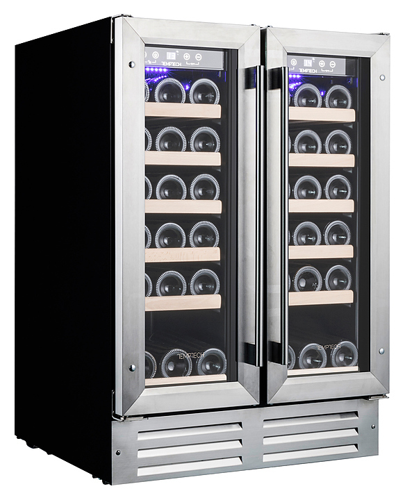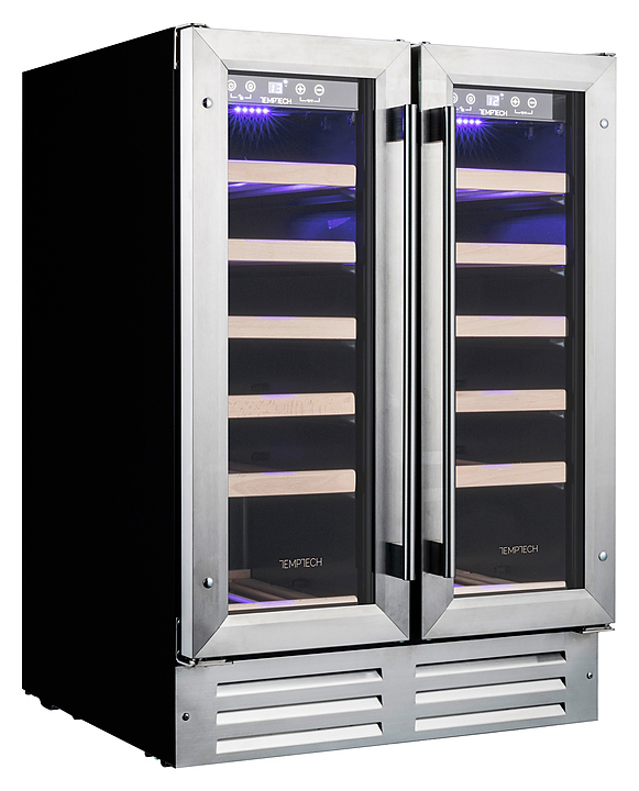 Винный шкаф Temptech Premium WP2DQ60DCS предназначен для охлаждения, хранения и демонстрации бутилированного вина в отелях, винных магазинах, на предприятиях общественного питания и торговли. Модель оснащена 2 камерами, сенсорными панелями с дисплеями для регулировки температуры и освещения, 12 выдвижными полками, 2 распашными дверцами, фильтром с активированным углем и синей светодиодной подсветкой. Дверцы выполнены из двухслойного стекла, заполненного аргоном, и с защитой от УФ-лучей, передняя панель - из нержавеющей стали, полки - из бука.