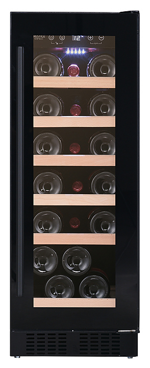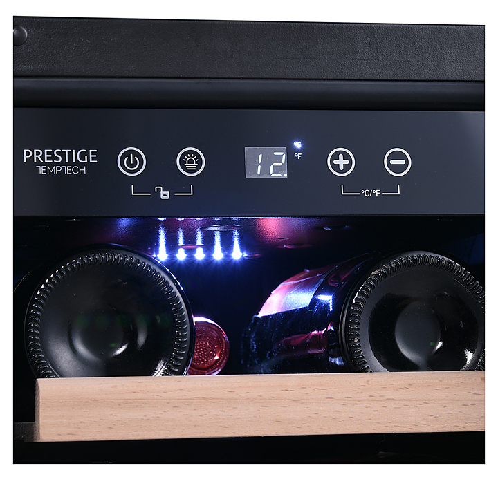 Винный шкаф Temptech Prestige PRESX30SB предназначен для охлаждения, хранения и демонстрации бутилированного вина в отелях, винных магазинах, на предприятиях общественного питания и торговли. Модель оснащена сенсорной панелью с дисплеем для регулировки температуры и освещения, 6 выдвижными полками, дверью с черной ручкой и белой светодиодной подсветкой. Дверца выполнена из трехслойного стекла с защитой от УФ-лучей, передняя панель - из черного стекла, полки - из бука.