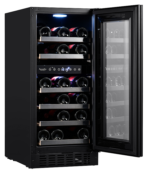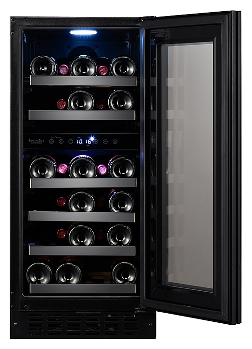 Винный шкаф Temptech Sommelier SOMQ38DRB предназначен для охлаждения, хранения и демонстрации бутилированного вина в отелях, винных магазинах, на предприятиях общественного питания и торговли. Модель оснащена сенсорной панелью с дисплеем для регулировки температуры и освещения, 6 выдвижными полками, дверью со встроенной ручкой, фильтром с активированным углем и белой светодиодной подсветкой. Дверца выполнена из двухслойного стекла с защитой от УФ-лучей, передняя панель - из черного стекла, полки - из дерева с черными деталями.