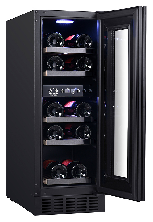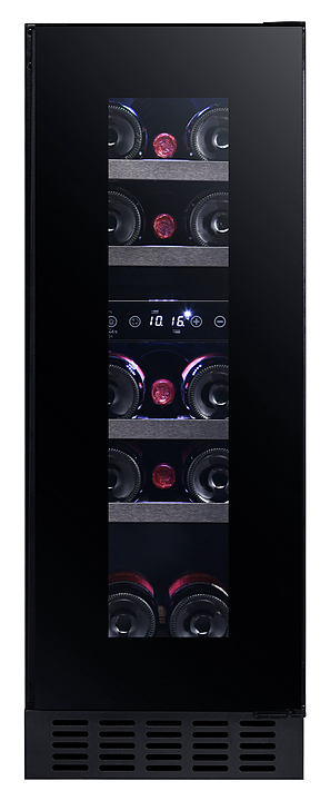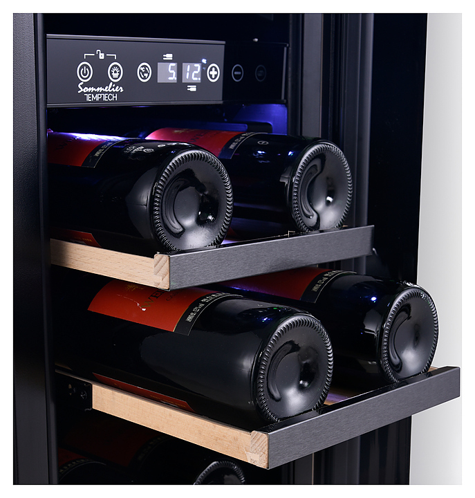 Винный шкаф Temptech Sommelier SOMX30DRB предназначен для охлаждения, хранения и демонстрации бутилированного вина в отелях, винных магазинах, на предприятиях общественного питания и торговли. Модель оснащена сенсорной панелью с дисплеем для регулировки температуры и освещения, 5 выдвижными полками, дверью со встроенной ручкой и белой светодиодной подсветкой. Дверца выполнена из двухслойного стекла с защитой от УФ-лучей, передняя панель - из черного стекла, полки - из дерева с черными деталями.