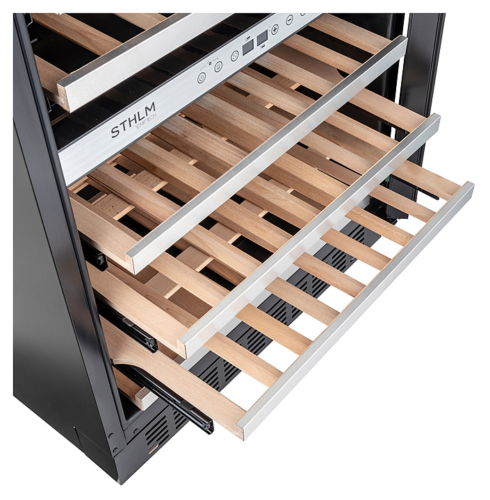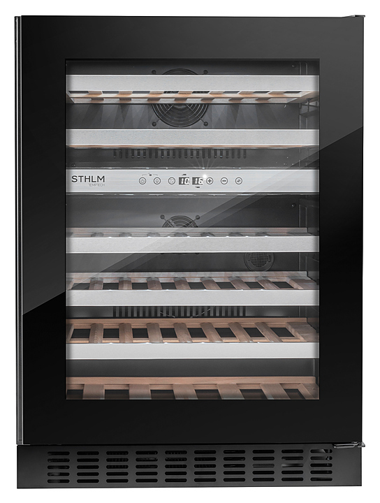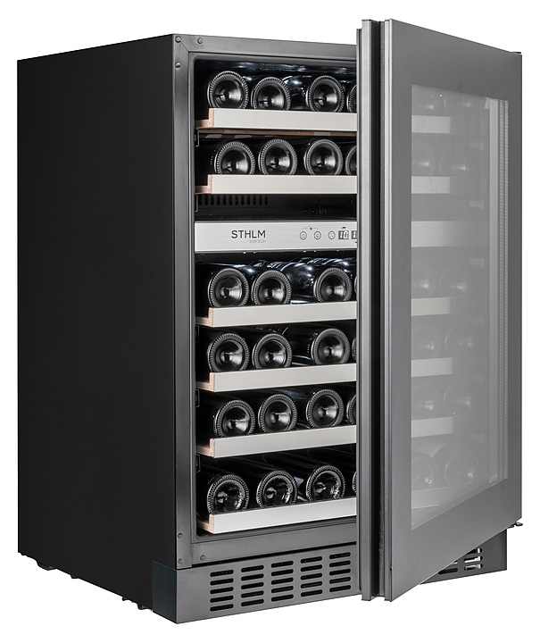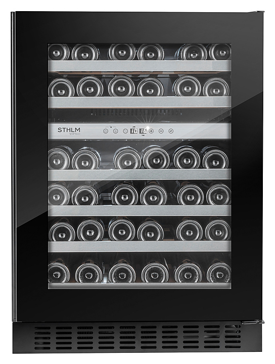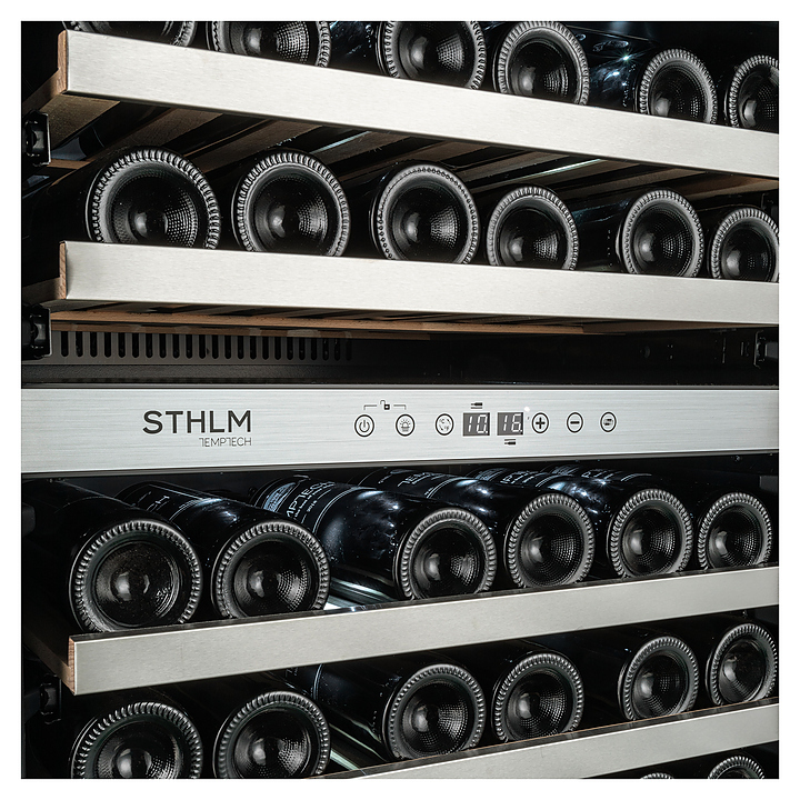 Винный шкаф Temptech STHLM STX60DRB предназначен для охлаждения, хранения и демонстрации бутилированного вина в отелях, винных магазинах, на предприятиях общественного питания и торговли. Модель оснащена сенсорной панелью с дисплеем для регулировки температуры и освещения, 6 выдвижными полками, дверцей со встроенной ручкой, фильтром с активированным углем и белой светодиодной подсветкой. Дверца выполнена из трехслойного стекла с защитой от УФ-лучей, передняя панель - из черного стекла, полки - из необработанного бука с деталями из нержавеющей стали.