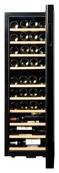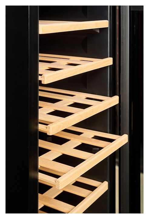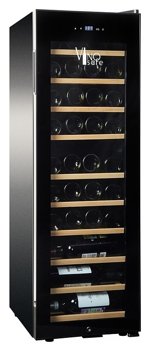 Винный шкаф Vinosafe VSF38AM предназначен для хранения при оптимальных условиях бутилированного вина различных сортов в барах, ресторанах, специализированных магазинах, подсобных складских помещениях, а также домашних условиях. Модель оснащена монотемпературной холодильной камерой, распашной дверью, прозрачным обзорным остеклением, внешней сенсорной панелью управления и цифровым дисплеем. Корпус и рама двери выполнены из металла с антикоррозийным покрытием черного цвета, полки – из массива буковой древесины.