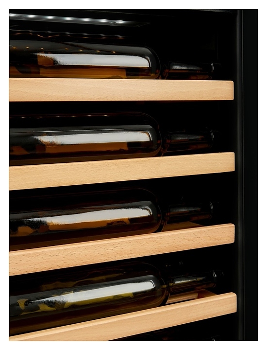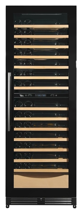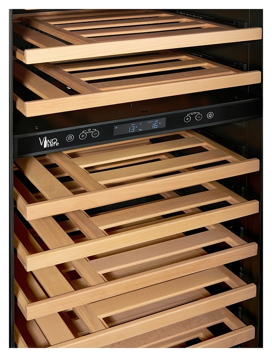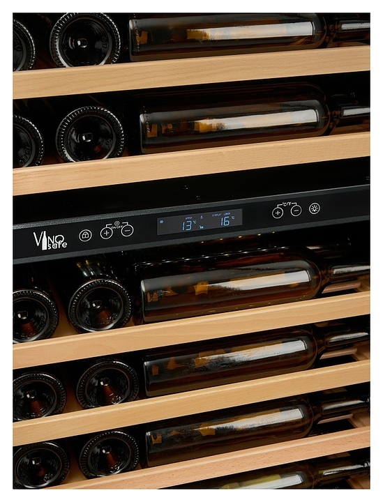 Винный шкаф Vinosafe VSN110BD предназначен для хранения при оптимальных условиях и демонстрации бутилированного вина различных сортов в барах, ресторанах, специализированных магазинах, складских помещениях, а также домашних условиях. Модель оснащена холодильной камерой с 2 независимыми температурными зонами, правосторонней перенавешиваемой распашной дверью на скрытых петлях, вертикальной рукояткой, цокольной воздушной решеткой, обзорным остеклением, кабелем питания с вилкой, расположенной внутри камеры панелью управления с сенсорными клавишами и жидкокристаллическим дисплеем с цифровыми и символьными сегментами индикации. Корпус, рама двери и рукоятка выполнены из металла с антикоррозийным покрытием черного цвета, внутренняя облицовка камеры черного цвета, полки и ящик – из массива древесины светлых пород.