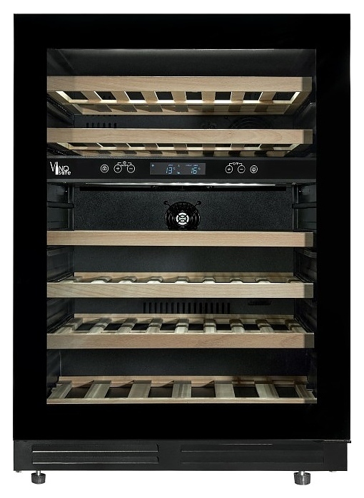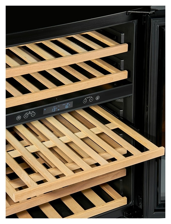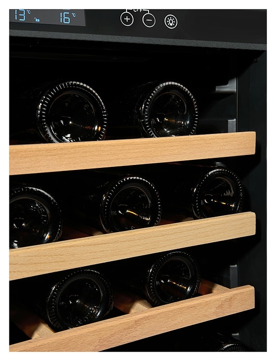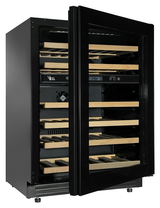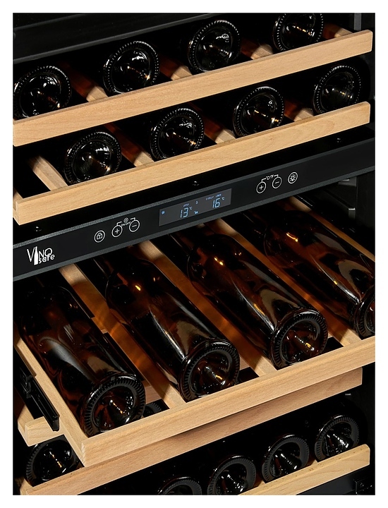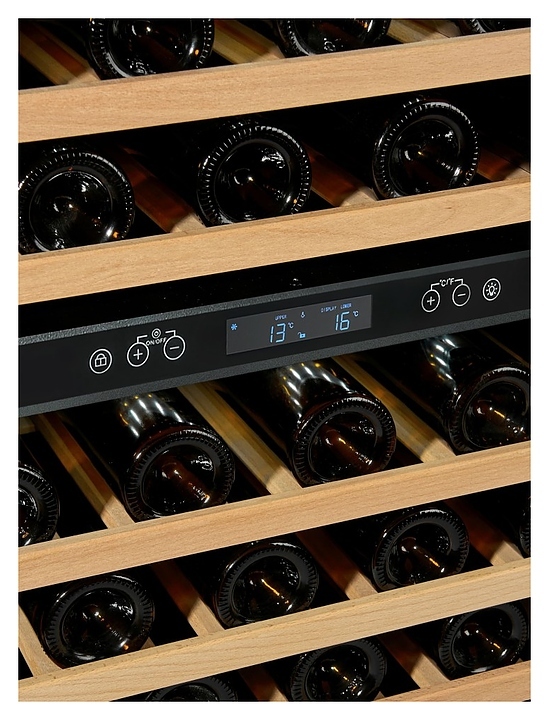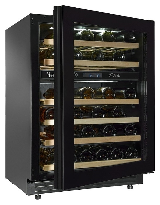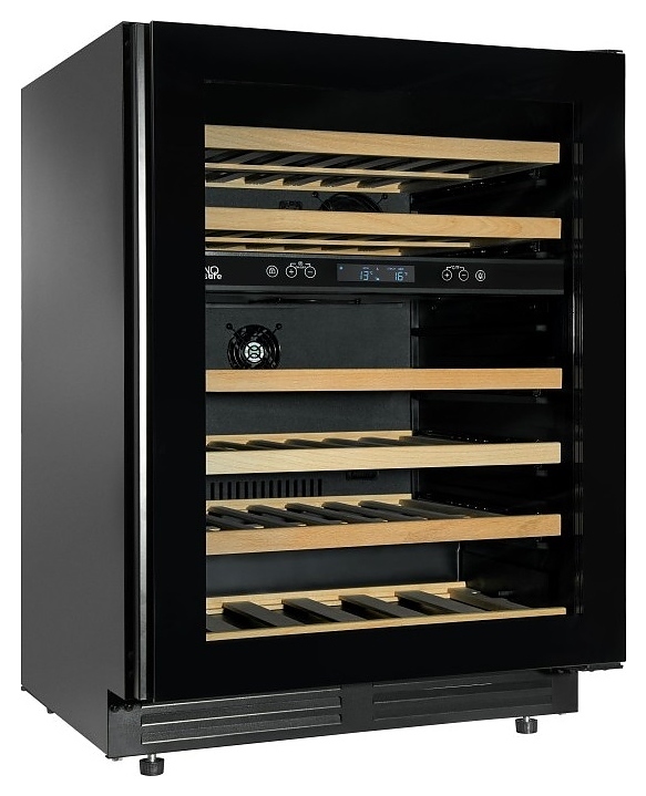Винный шкаф Vinosafe VSU46BD предназначен для хранения при оптимальных условиях и демонстрации бутилированного вина различных сортов в барах, ресторанах, специализированных магазинах, складских помещениях, а также домашних условиях. Модель оснащена холодильной камерой с 2 независимыми температурными зонами, правосторонней перенавешиваемой распашной дверью на скрытых петлях, цокольной воздушной решеткой, обзорным остеклением, кабелем питания с вилкой, расположенной внутри камеры панелью управления с сенсорными клавишами и жидкокристаллическим дисплеем с цифровыми и символьными сегментами индикации. Корпус и рама двери выполнены из металла с антикоррозийным покрытием черного цвета, внутренняя облицовка камеры черного цвета, полки – из массива древесины светлых пород.