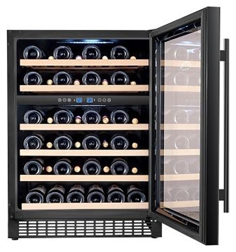 Винный шкаф Vinosafe VSU51BD предназначен для хранения при оптимальных условиях бутилированного вина различных сортов в барах, ресторанах, специализированных магазинах, подсобных складских помещениях, а также домашних условиях. Модель оснащена холодильной камерой с 2 температурными зонами, распашной дверью, длинной вертикальной рукояткой, цокольной воздушной решеткой, прозрачным обзорным остеклением, внутренней сенсорной панелью управления и цифровым дисплеем. Корпус, рама двери и рукоятка выполнены из металла с антикоррозийным покрытием черного цвета, полки – из массива буковой древесины.