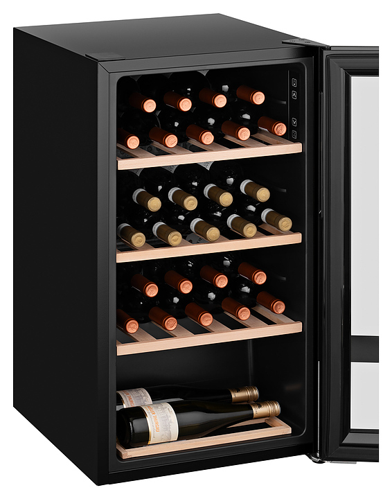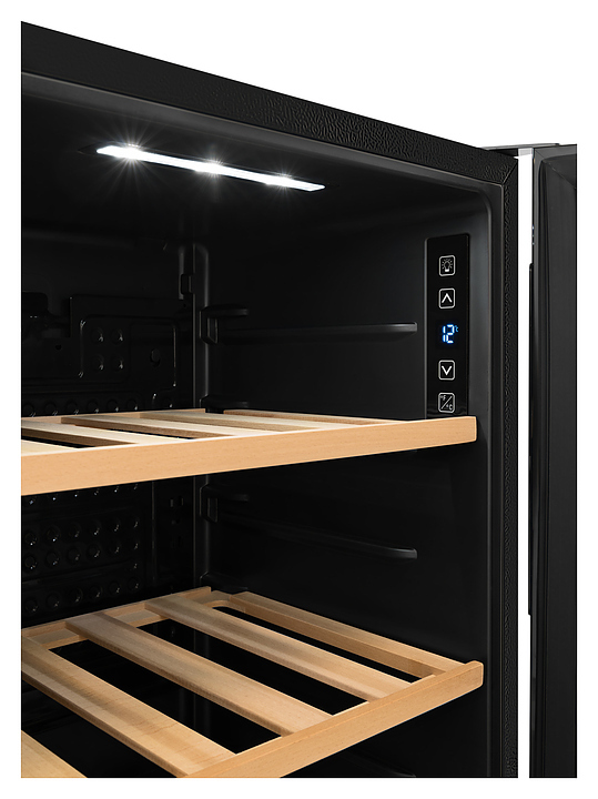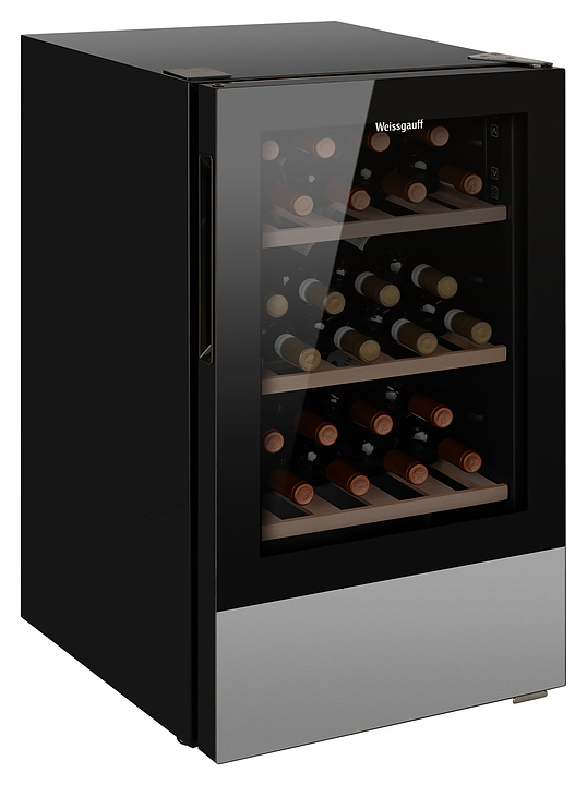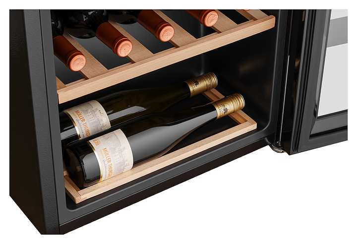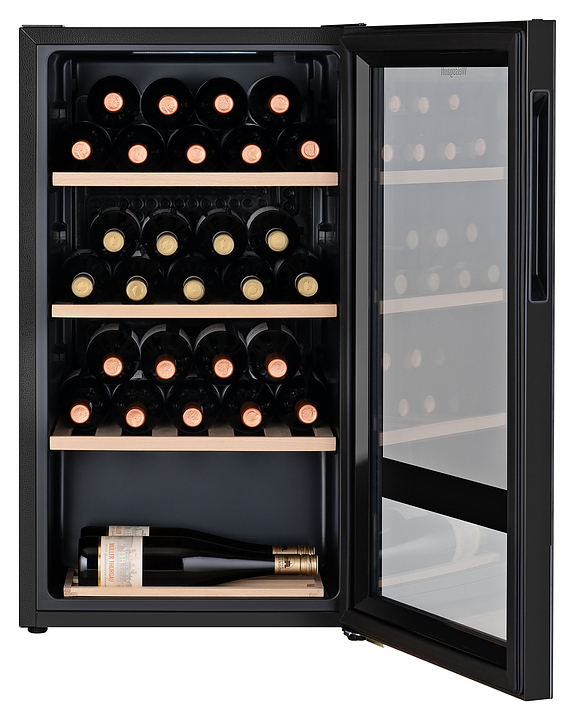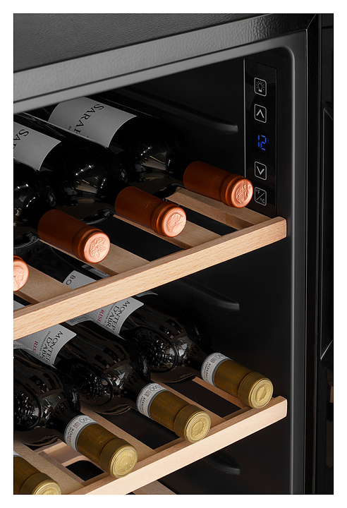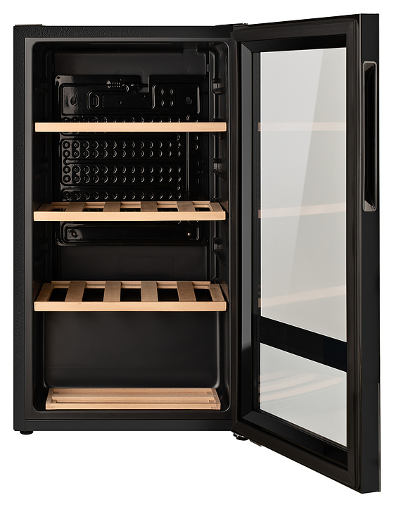 Винный шкаф Weissgauff WWC-30 Bottle предназначен для хранения при оптимальных условиях и демонстрации бутилированного вина различных сортов в барах, ресторанах, специализированных магазинах, складских помещениях, а также домашних условиях. Модель оснащена монотемпературной холодильной камерой, правосторонней перенавешиваемой распашной дверью на внешних петлях, обзорным остеклением, кабелем питания с вилкой, расположенной внутри камеры панелью управления с сенсорными клавишами и светодиодным цифровым дисплеем с голубой подсветкой индикации. Корпус и рукоятка выполнены из металла с антикоррозийным покрытием черного цвета, внутренняя облицовка камеры черного цвета, фронт двери – из закаленного стекла с дымчатой тонировкой и непрозрачной вставкой в нижней части серого оттенка, полки – из массива древесины светлых пород.