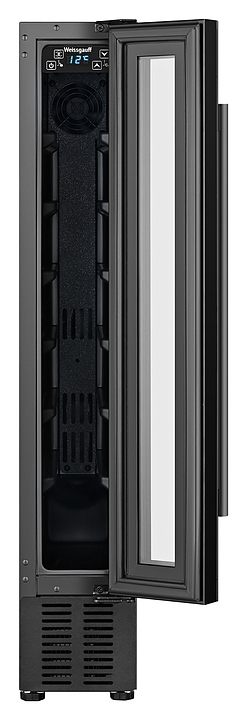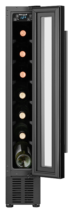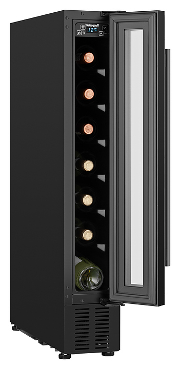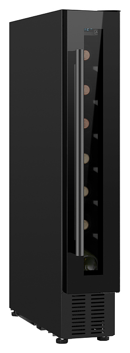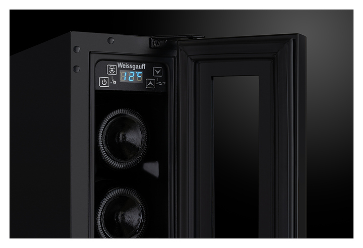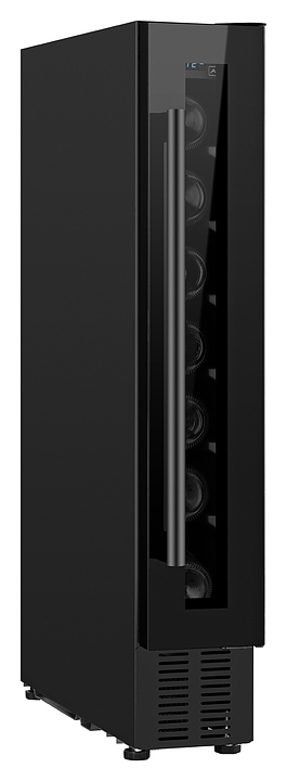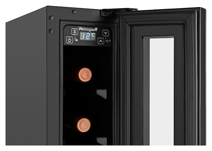 Винный шкаф Weissgauff WWC-7 B предназначен для хранения при оптимальных условиях и демонстрации бутилированного вина различных сортов в барах, ресторанах, специализированных магазинах, складских помещениях, а также домашних условиях. Модель оснащена монотемпературной холодильной камерой с 7 уровнями интегрированных направляющих для размещения бутылок, правосторонней перенавешиваемой распашной дверью на внешних петлях, длинной вертикальной рукояткой, цокольной воздушной решеткой, обзорным остеклением, кабелем питания с вилкой, расположенной внутри камеры панелью управления с сенсорными клавишами и светодиодным цифровым дисплеем с голубой подсветкой индикации. Корпус и рукоятка выполнены из металла с антикоррозийным покрытием черного цвета, фронт двери – из закаленного стекла с дымчатой тонировкой, внутренняя облицовка камеры черного цвета.