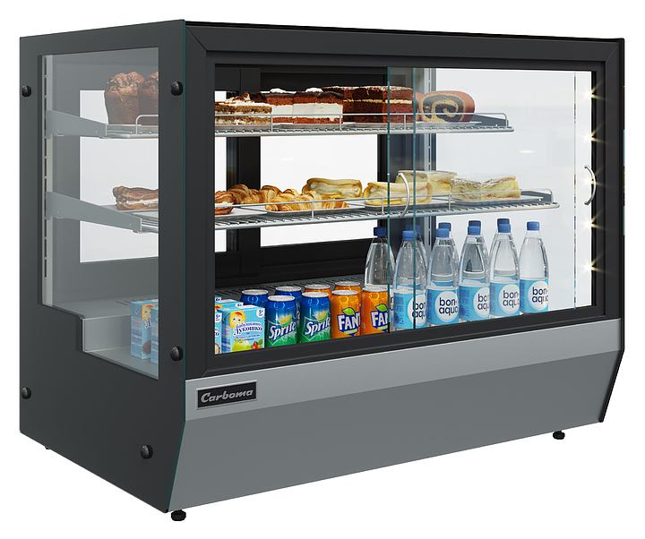 Барная витрина Carboma AMRA AC59 VM 0,7-1 Slider используется в небольших барах и кафе, на предприятиях общественного питания и торговли для демонстрации, охлаждения, кратковременного хранения и продажи кондитерских изделий, десертов, салатов и напитков. Модель оснащена боковыми закаленными стеклопакетами, раздвижными фронтальными и задними дверцами и 2 охлаждаемыми полками-решетками с ограничителями. Благодаря универсальному исполнению витрина может встраиваться в барную стойку или располагаться на ней. Корпус выполнен из стали с ППУ-теплоизоляцией, экспозиционная поверхность - из нержавеющей стали.