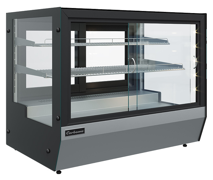 Барная витрина Carboma AMRA AC59 VM 0,9-1 Slider используется в небольших барах и кафе, на предприятиях общественного питания и торговли для демонстрации, охлаждения, кратковременного хранения и продажи кондитерских изделий, десертов, салатов и напитков. Модель оснащена боковыми закаленными стеклопакетами, раздвижными фронтальными и задними дверцами и 2 охлаждаемыми полками-решетками с ограничителями. Благодаря универсальному исполнению витрина может встраиваться в барную стойку или располагаться на ней. Корпус выполнен из стали с ППУ-теплоизоляцией, экспозиционная поверхность - из нержавеющей стали.