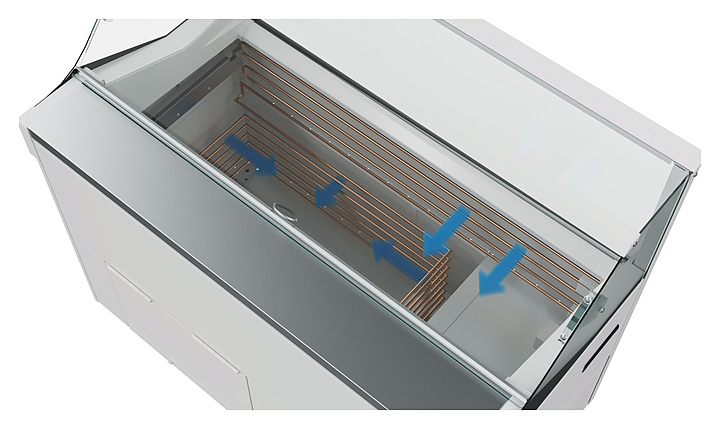- Twinfreez TM: технология одноконтурной морозильной цепи из 2 элементов (трубчатый для охлаждения резервной зоны и трубчато-ребристый для охлаждения зоны выкладки)