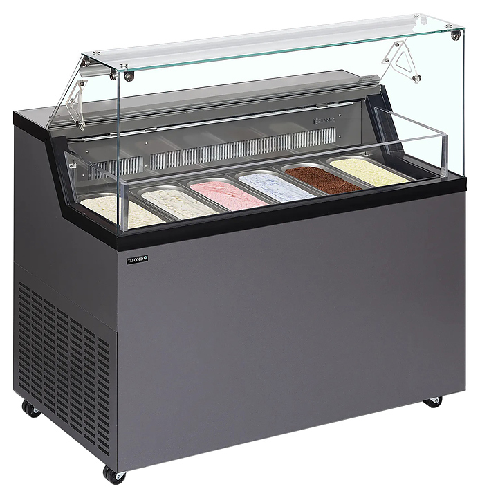 Напольная морозильная витрина TEFCOLD MIRABELLA 6 предназначена для эффектной демонстрации и кратковременного предпродажного хранения порционных мороженого, сорбетов и других холодных десертов в гастроемкостях на предприятиях общественного питания и торговли. Модель оснащена подставкой с встроенным компрессорным агрегатом, и обзорным остеклением с прямым фронтом. Внутренняя облицовка выполнена из нержавеющей стали и окрашенной в серый цвет пластифицированной стали, экстерьер корпуса цвета антрацит (RAL 7016), остекление – из прозрачного закаленного стекла, теплоизоляция – из пенополиуретана.