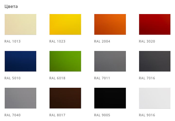 Модель доступна в 12 стандартных цветовых исполнениях верхней и нижней панели по таблице RAL: 1013, 1023, 2004, 3020, 5010, 6018, 7011, 7016, 7040, 8017, 9005 и 9016.
